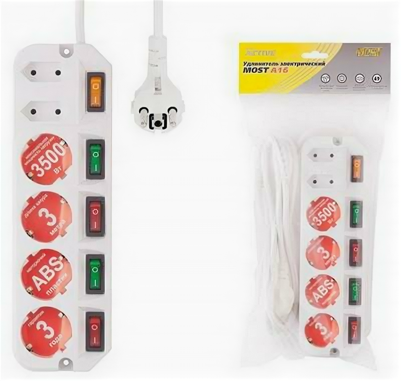 Удлинитель Most А16 предназначен для подключения бытовой техники к сети электропитания. У каждой из четырех евророзеток имеется мощный (16A) индивидуальный выключатель,который обеспечивает удобство обращения с электропитанием и экономит Ваше время. Две узкие розетки имеют общий выключатель. Удлинитель Most A16 обеспечивает удобную эксплуатацию и подключение техники мощностью до 3.5кВт к розетке.