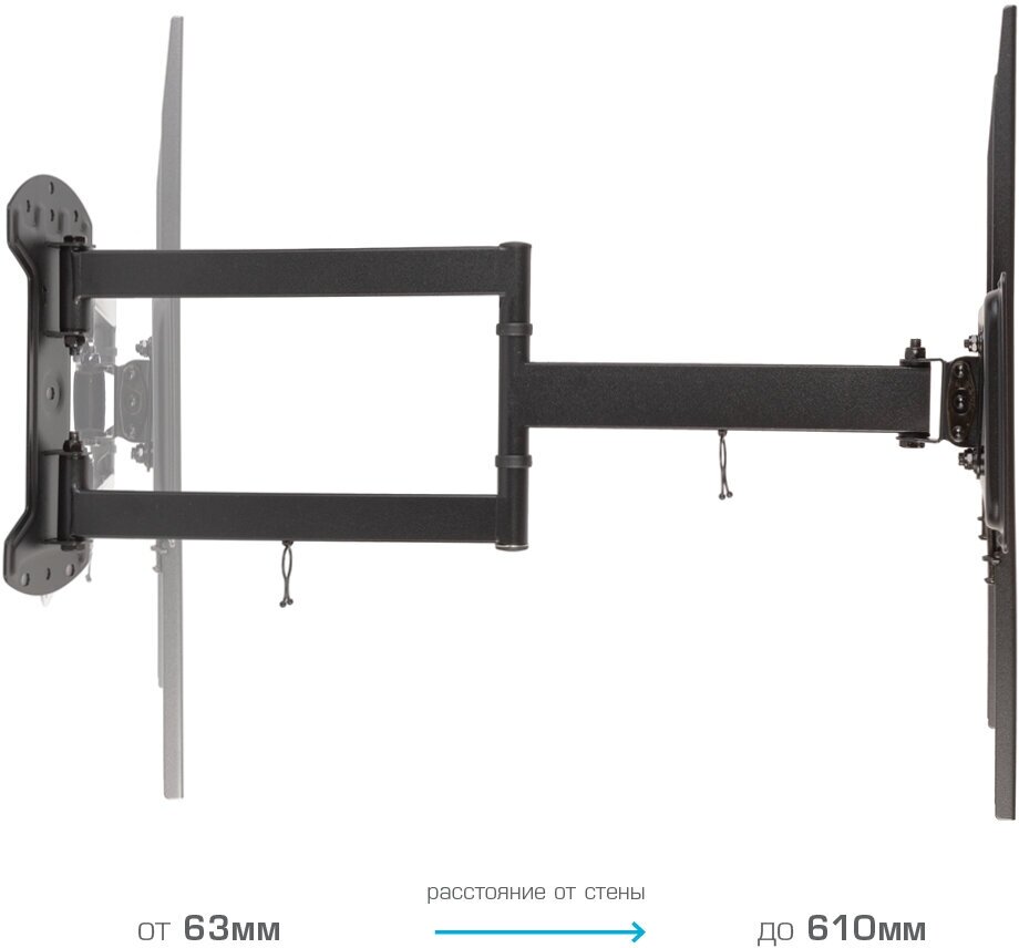 | Дополнительно | Надежная стальная конструкция,Универсальный-телевизор на кронштейне можно наклонить, повернуть и сдвинуть к стене,Корректировка экрана - вращение экрана в горизонтальной плоскости на ±3° ,Широкое настенное основание,Большой вынос от стены 610 мм,Кабель-канал |