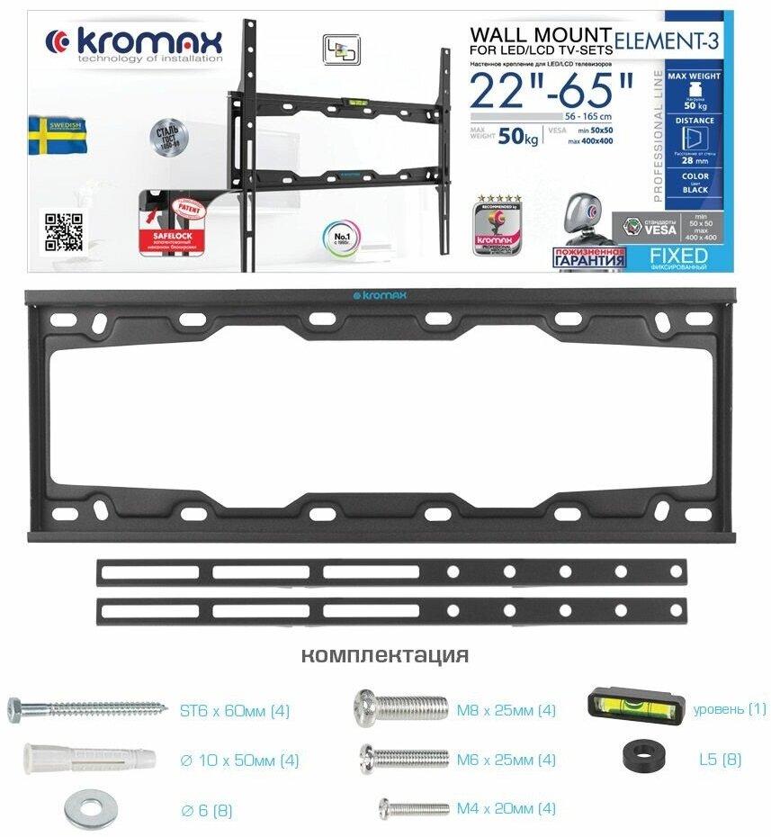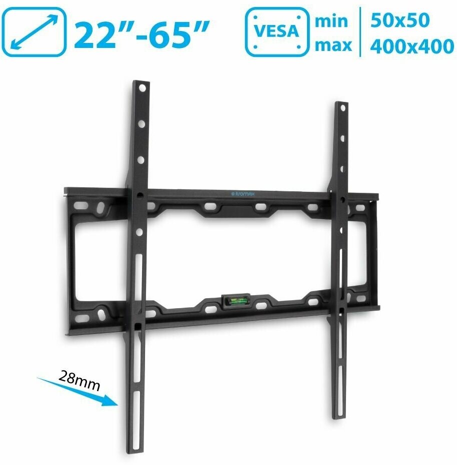 Кронштейн Kromax для LED/LCD TV 22"-65", max 50 кг, 0 ст свободы, от стены 28мм, max VESA 400x400 мм, автомат замок - фиксатор