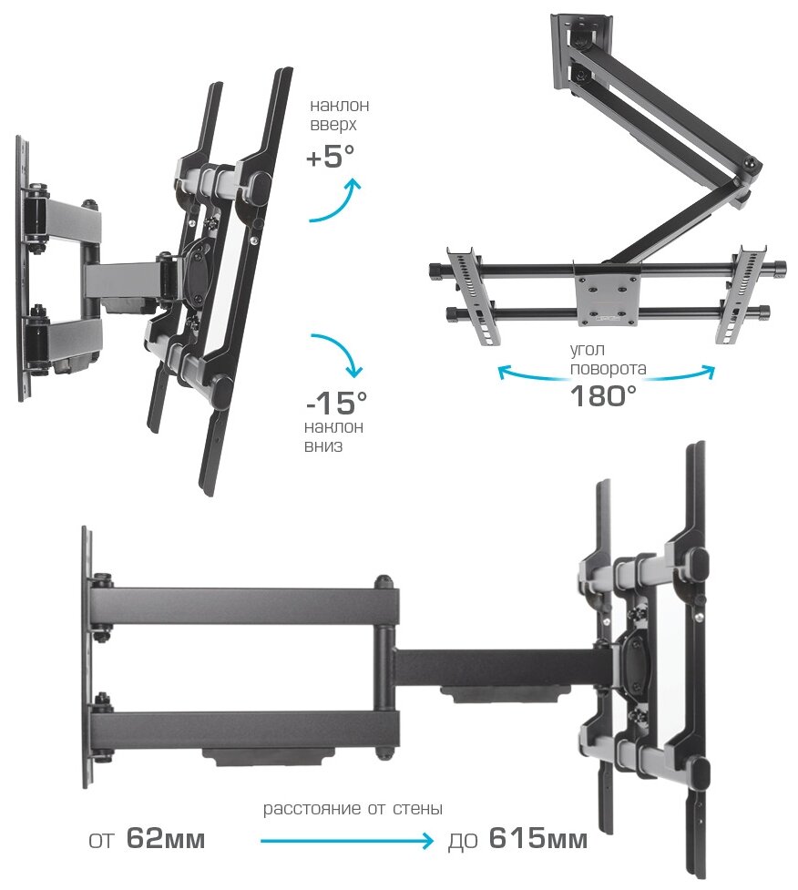- Кронштейн сделан очень качественно. Люфта в соединениях нет. Крепеж разнообразный в комплекте есть. Телевизор 55" на данный кронштейн прекрасно крепится.