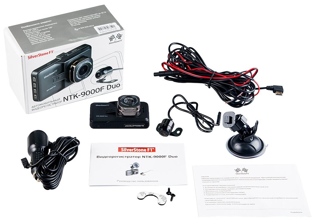 | Комплектация | - Видеорегистратор SilverStone F1 NTK-9000F Duo- Провод питания для подключения в гнездо прикуривателя- Крепление на лобовое стекло автомобиля- Камера заднего вида и провода для подключения- Саморезы и двусторонний скотч для крепления камеры заднего вида- USB-кабель- Руководство пользователя (инструкция по эксплуатации)- Гарантийный талон |