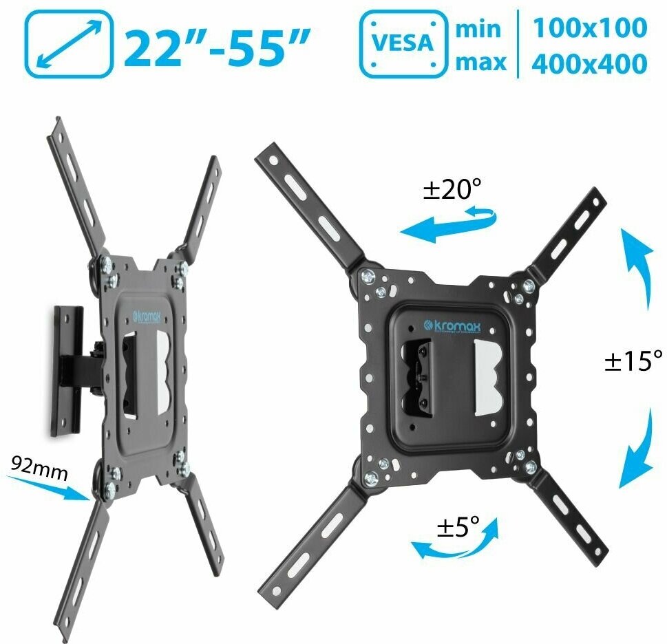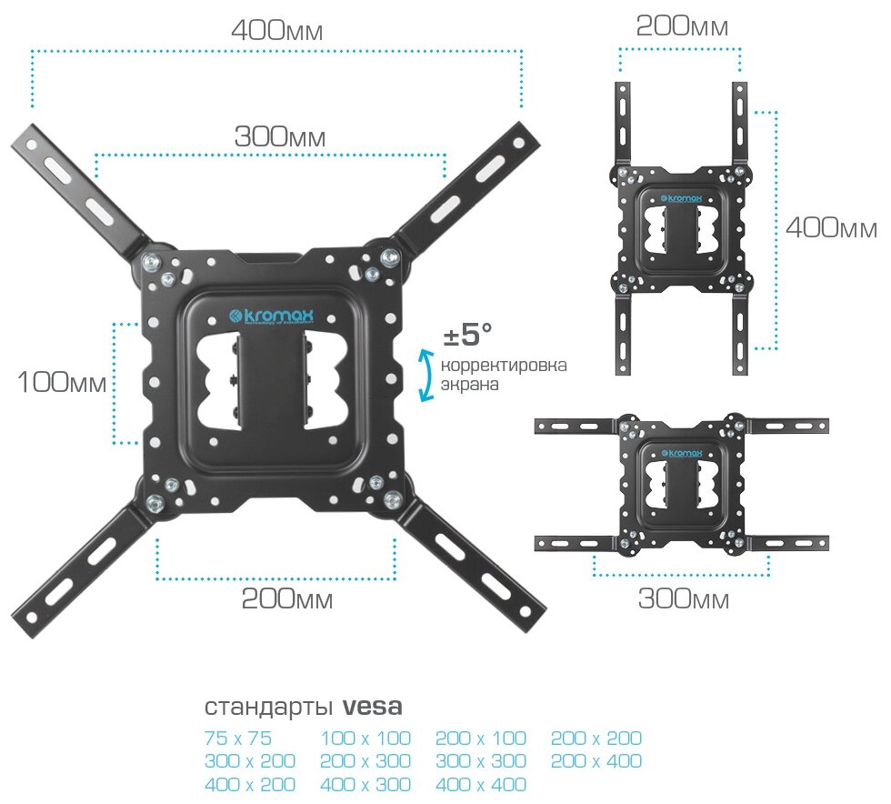 Kromax станет великолепным выбором для техники размером от 22 до 55 дюймов. Благодаря надежной конструкции модель выдержит нагрузку до 30 кг.