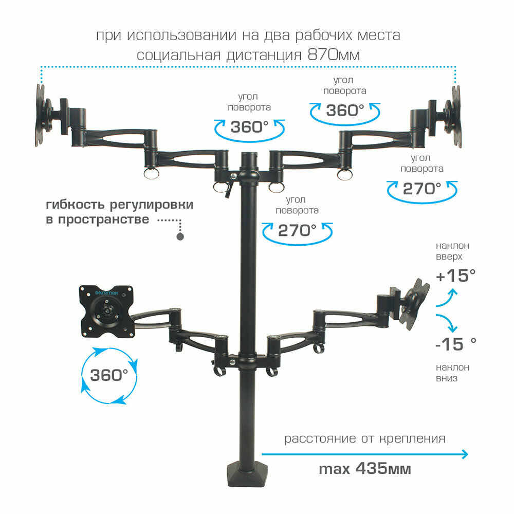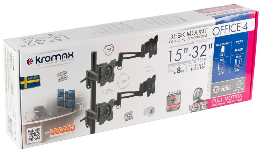 Вся конструкция крепится на струбцину к столу. KROMAX рассчитан на мониторы с диагональю от 15 до 32 дюймов и солидный вес (4x8 кг).