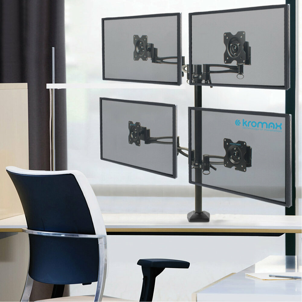 Крепление для мониторов KROMAX предназначено для четырех мониторов. Оно дает широкие возможности для маневров: экраны можно поворачивать практически во все стороны благодаря подвижным рейкам, способным сгибаться, и шарнирам в основании посадочных мест. Такая маневренность позволяет не только удобно расположить мониторы относительно одного пользователя, но и быстро изменять их положение, чтобы продемонстрировать изображение другому человеку или убрать солнечные блики.