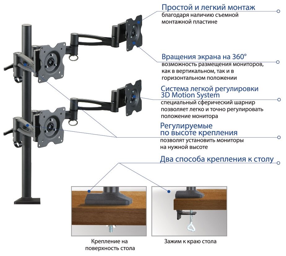 | Дополнительно | Простой и легкий монтаж благодаря наличию съемной монтажной пластине Вращения экрана на 360° возможность размещения мониторов, как в вертикальном, так и в горизонтальном положении Система легкой регулировки 3D Motion System специальный сферический шарнир позволяет легко и точно регулировать положение монитора Регулируемые по высоте крепления позволят установить мониторы на нужной высоте Два способа крепления к столу |
