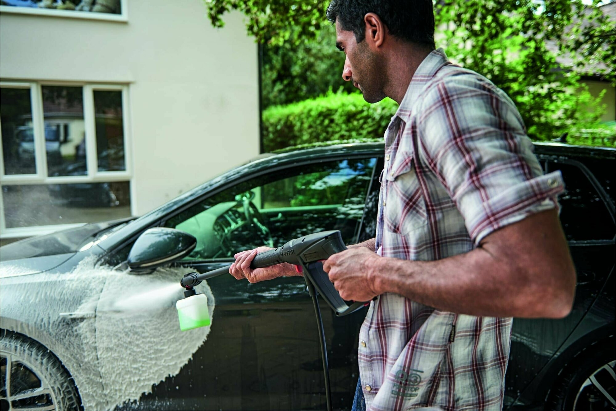 - Штатный пенник ерунда (в плане малообьемный), а так пенит хорошо. Быстро выдувает 300 мл шампуня. Хватает на половину машины.