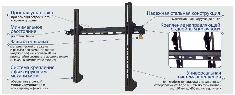 | Дополнительно | Простая установка при помощи встроенного водяного уровня,Минимальное расстояние до стены 34 мм ,Защита от кражи - металлический стержень и разъём для замка позволят надежно зафиксировать ТВ на кронштейне соответствующим замком (* замок в комплект не входит) ,Система крепления с фиксирующим механизмом ,Надежная стальная конструкция ,Крепление направляющей с «двойным крючком» ,Универсальная система крепления ,для любого телевизора с посадочными отверстиями от 32 до 400 мм по горизонтали и от 50 мм до 400 мм по вертикали |
