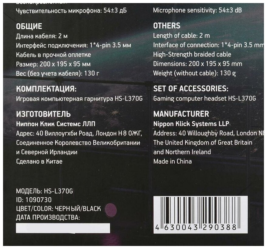 | Комплектация | Игровая компьютерная гарнитура HS-L370G, Руководство пользователя |