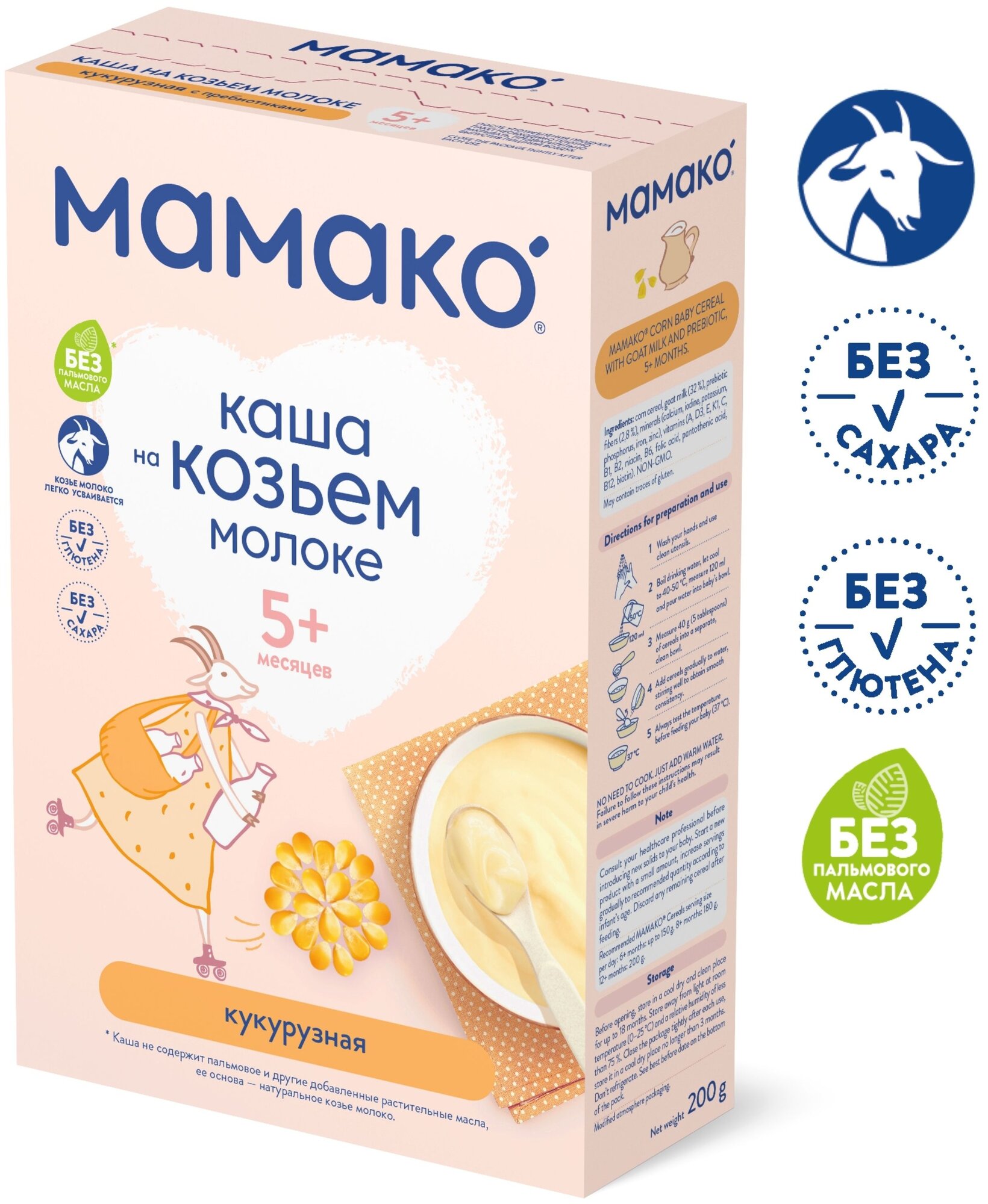 Кукурузная каша МАМАКO с пребиотиками на козьем молоке.Кукурузная каша МАМАКO с пребиотиками для детей старше 5 месяцев — низкоаллергенная рецептура для первого прикорма и улучшения пищеварения.100% натуральный состав.Обогащена комплексом витаминов и минералов.Высокая доля козьего молока в составе каши (32%).Не содержит коровьего молока.Без глютена.Без сахара.Без крахмала.Без растительных масел.Без консервантов, красителей и ароматизаторов.Без ГМО.Полезные свойства:Фосфолипиды кукурузы оказывают защитное и противовоспалительное действие на нежную пищеварительную систему малыша.Комплекс пребиотиков Orafti Synergy 1 в составе каши стимулирует развитие собственной здоровой микрофлоры и улучшает работу кишечника.Благодаря козьему молоку, отсутствию глютена в кукурузе и очистке зерна, низкоаллергенная каша МАМАКO легко усваивается и может быть использована для первого прикорма.Все каши МАМАКO обогащены 13 витаминами и 7 минералами, включая комплекс Ca-Fe-I для профилактики рахита, железодефицитной анемии и йододефицита, которые по данным Союза педиатров России наблюдаются у 30–60 % детей раннего возраста.В каждой каше МАМАКO содержится 32 % козьего молока, которое за счет своих структурных свойств увеличивает биодоступность кальция и железа на 20%.Состав: кукурузная крупа, козье молоко (32%), пребиотические волокна, комплекс минералов (карбонат кальция, пирофосфат железа, йодид калия, сульфат цинка), комплекс витаминов (A, D, E, K, C, B1, B2, B6, B12, ниацин, фолиевая кислота, пантотеновая кислота, биотин).