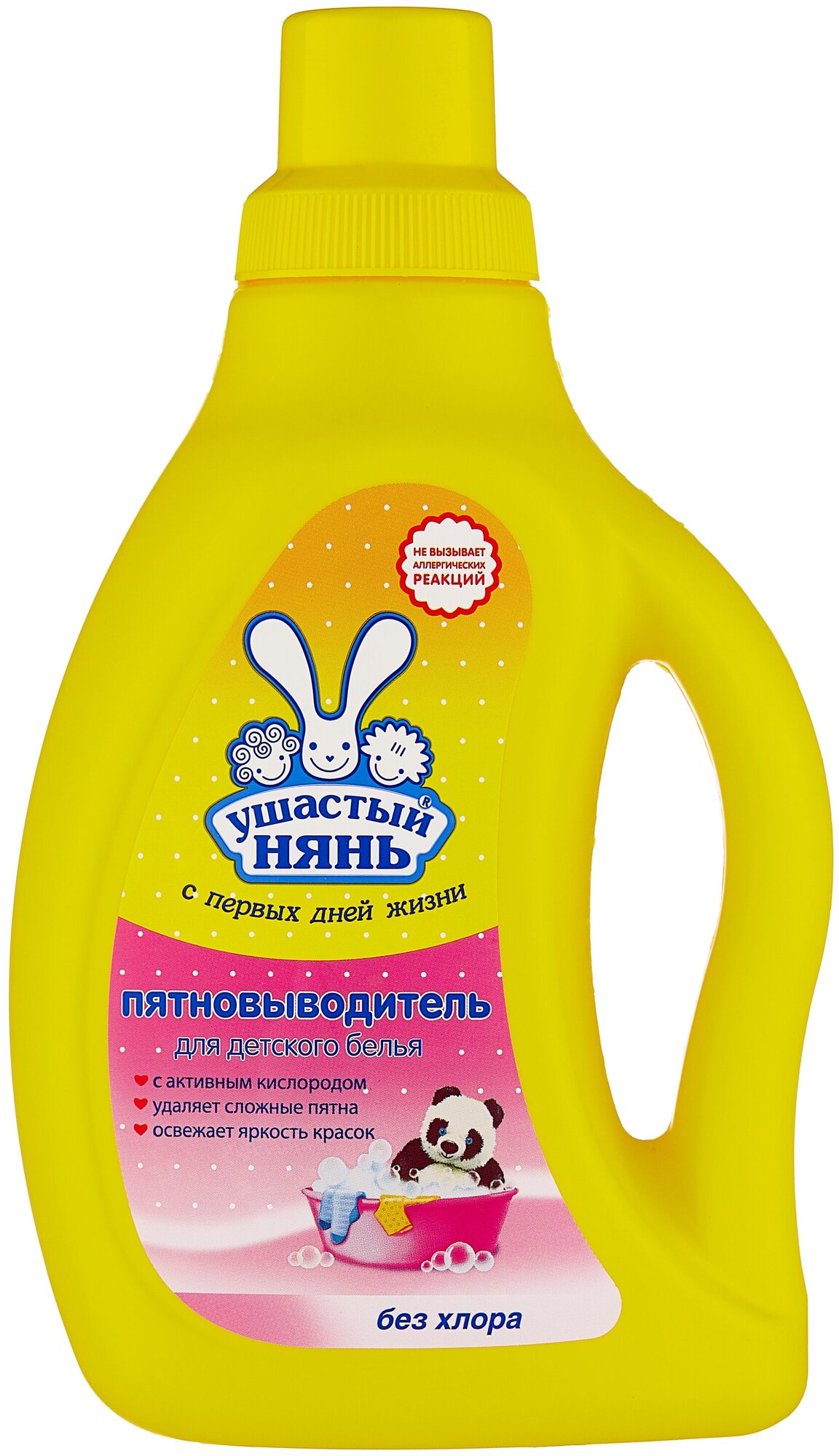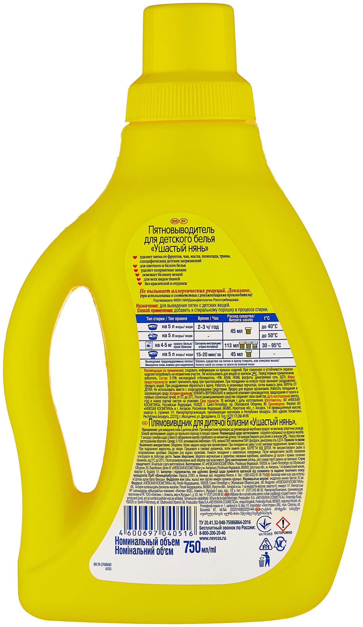 Пятновыводитель для детского белья Ушастый Нянь гель 750 мл. Назначение: Cпециально создано для стирки детского белья, в том числе новорожденных. Подходит для стирки белых и цветных вещей в автоматических стиральных машинах и вручную. Эффективно справляется с основными загрязнениями и результатами жизнедеятельности малышей, биологически сложными пятнами. (соки, фрукты, ягоды, трава, шоколад, кровь и т.п.). Легко выполаскивается. Способ применения: Добавить к стиральному порошку. Замачивание (на 5 л воды) на 2-3 часа: 45 мл (1К) при температуре 20 - 40С; Ручная стирка (на 5 л воды): 45 мл (1 К) при температуре 35 - 45С; Стирка в автоматических стиральных машинах (на 4-5 кг белья): 113 мл (2,5 К) при температуре 40 - 95С; Кипячение со стиральным порошком (на 5 л воды) на 15 - 20 мин: 45 мл (1К); Выведение трудноудалимых пятен: налить средство на пятно и сразу стирать, как описано выше. Не использовать для вещей со знаком "не отбеливать". 1К (колпачок) = 45 мл. Меры предосторожности: может причинить вред при про