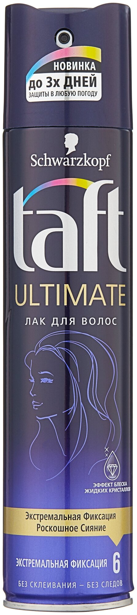 Роскошное сияние – экстремальная фиксация. Наивысшая степень фиксации Taft для превосходного результата! Роскошное сияние волос с эффектом блеска жидких кристаллов. Формула Taft для превосходной фиксации и защиты укладки до 3-х дней в любую погоду: от ветра, влажности, УФ-лучей и от влияния загрязнения окружающей среды.• Фиксация укладки до 3 дней без склеивания и следов.• Помогает защитить волосы от пересушивания, не утяжеляя их.• Защита в любую погоду.