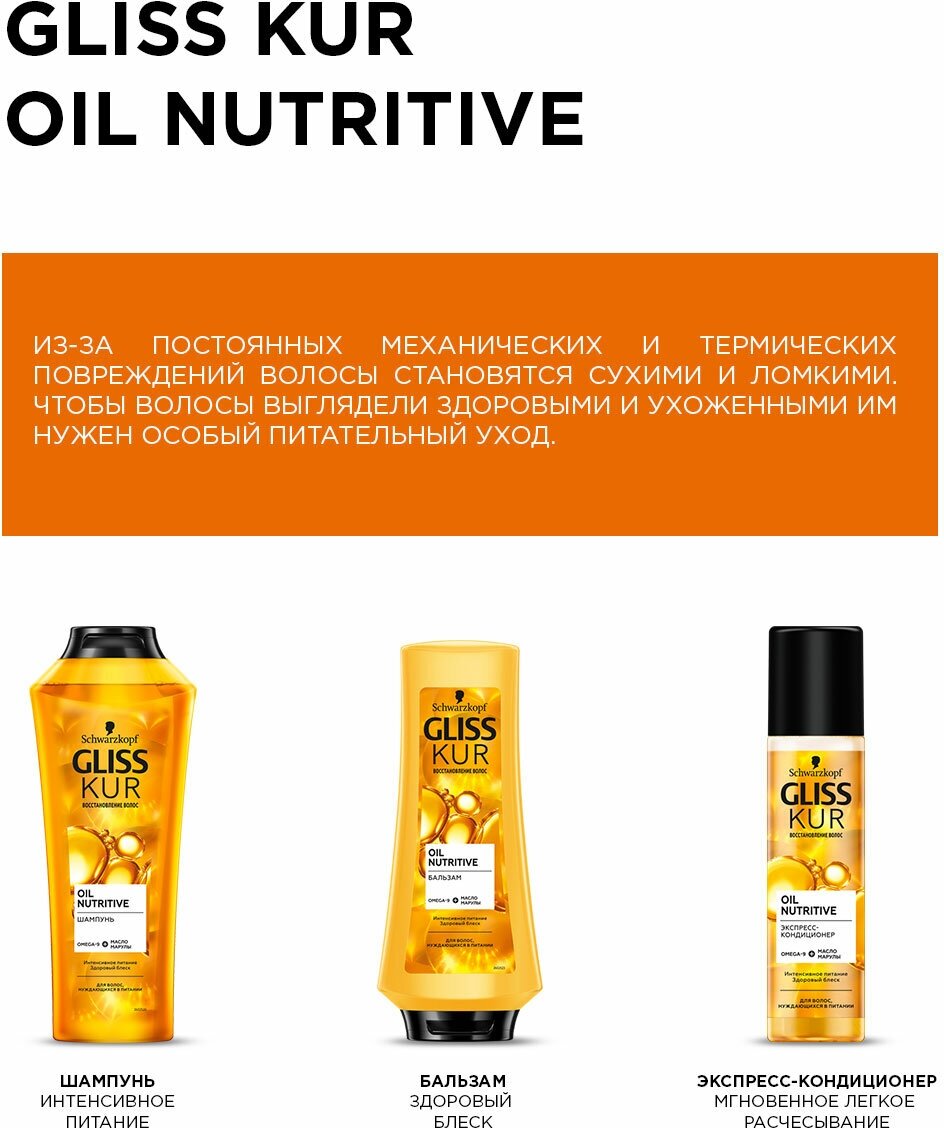 Из-за постоянных механических и термических повреждений волосы становятся сухими и ломкими. Чтобы волосы выглядели здоровыми и ухоженными им нужен особый питательный уход. Gliss Kur Oil Nutritive обеспечивает: Мгновенное легкое расчесывание. Интенсивное питание и восстановление. Здоровый блеск.