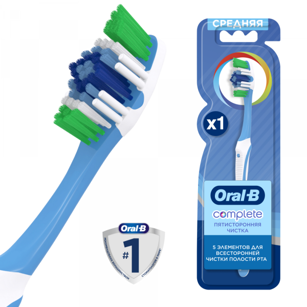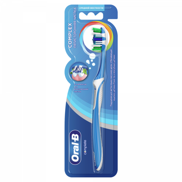 Oral-B - марка зубных щеток №1, рекомендуемая большинством стоматологов мира.* * по данным исследования, проведенного в 2011-2012 году агентством Attitude Measurement Corporation среди репрезентативной выборки стоматологов. Зубная щетка Oral-B КОМПЛЕКС Пятисторонняя чистка - это 5 элементов для более тщательной чистки:* 1) Щетинки Power Tip очищают труднодоступные участки, 2) Ряд щетинок Interdental чистят участки между зубами, 3) Отбеливающая чашечка полирует поверхность зуба, 4) Массирующие десны щетинки ухаживают за Вашими дёснами, 5) Поверхность для чистки языка помогает удалить больше бактерий полости рта для более длительного ощущения свежести. * по сравнению с обычной зубной щёткой с ровно подстриженной щетиной.
