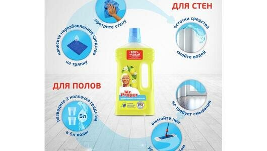 Сделайте дом чистым с универсальным моющим средством Mr. Proper с ароматом лимона.Средство подходит не только для мытья пола, но и для стен и корпусной мебели. Жидкость без труда очищает кафель, ламинат, линолеум и другие твердые поверхности, не оставляя разводов. Особенности моющего средства Мистер Пропер: УНИВЕРСАЛЬНОСТЬ. Подходит для уборки кухни, гостиной, ванной и любых других помещений в доме. УДОБСТВО ИСПОЛЬЗОВАНИЯ. Удаляет до 100 % загрязнений и неприятные запахи, не требует смывания. НЕ ВРЕДИТ ПОКРЫТИЯМ. Подходит для всех типов полов. ДЕРМАТОЛОГИЧЕСКИ ПРОТЕСТИРОВАНО. Формула без агрессивных ПАВ и ароматизаторов. Разведите Мистер Пропер для пола в теплой воде и начните уборку. Раствор хорошо удаляет жировые загрязнения, домашнюю пыль, следы от лап животных. Экономичной упаковки объемом 1,5 л хватит на несколько циклов уборки.