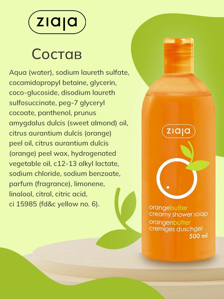 Крем-мыло жидкое ZIAJA с апельсиновым маслом. Содержит мягкие очищающие вещества растительного происхождения. Действует мягко на кожу, не сушит её и не вызывает раздражения. Не нарушает естественный pH баланс и защитный слой эпидермиса. Мягко питает и заметно разглаживает кожу. Оказывает эффективное защитное действие на эпидермис. Интенсивно увлажняет и предотвращает чрезмерную потерю влаги. Активные вещества: - апельсиновое масло - получаемое из апельсиновой корки, дарит натуральный апельсиновый цвет и аромат, характеризуется высоким содержанием биофлавоноидов, оказывает антицеллюлитное и укрепляющее, снимает раздражение, отлично питает и эффективно предотвращает сухость эпидермиса; - коко-гликозиды - кондиционирующие вещества натурального происхождения, обеспечивают оптимальные результаты применения, снижает обезжиривающее последствие очищающих средств, эффективно увлажняет и предотвращает сухость кожи. - D-пантенол - увлажняет кожу и эффективно успокаивает раздражения.