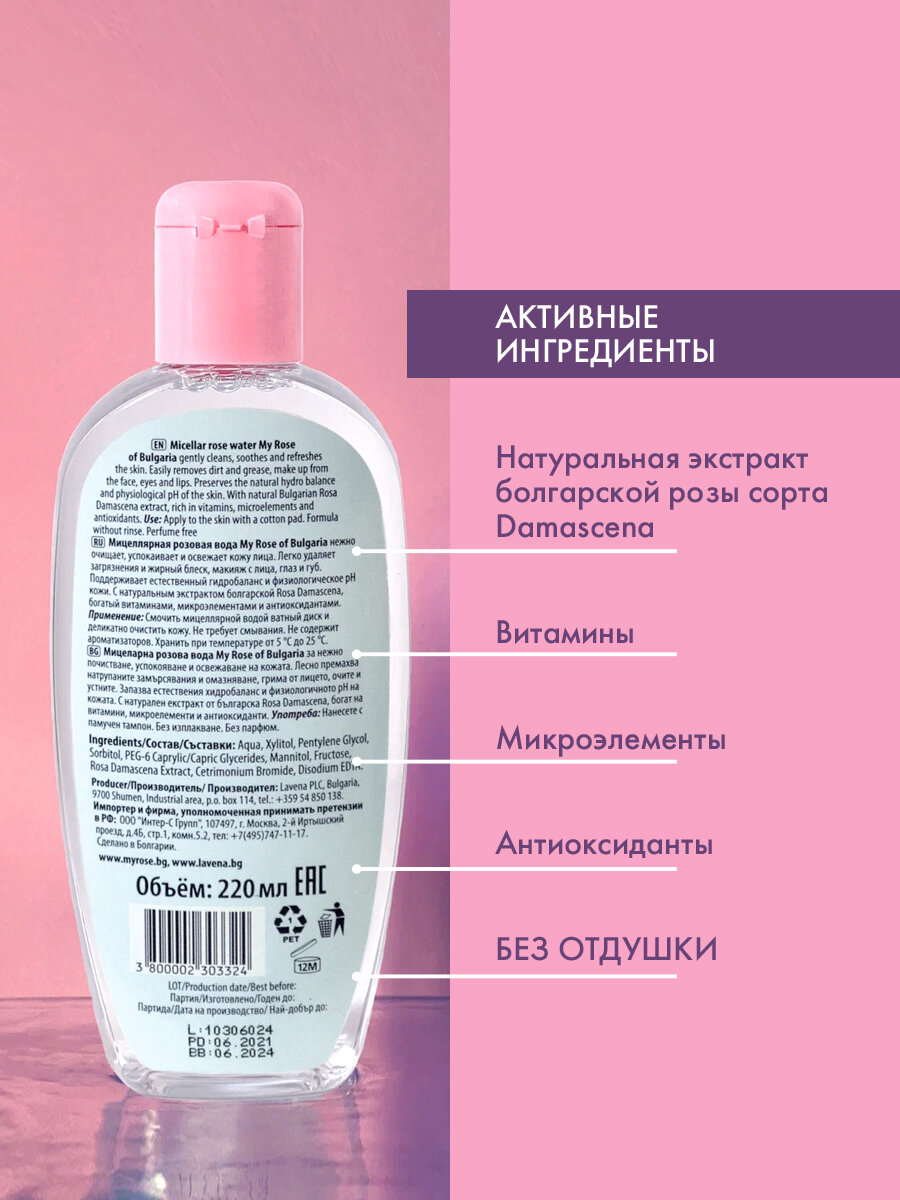 Содержит натуральную розовую воду болгарской Rosa Damascena, богатую микрокаплями эфирного масла, которые проникают внутрь, увлажняют и успокаивают кожу.