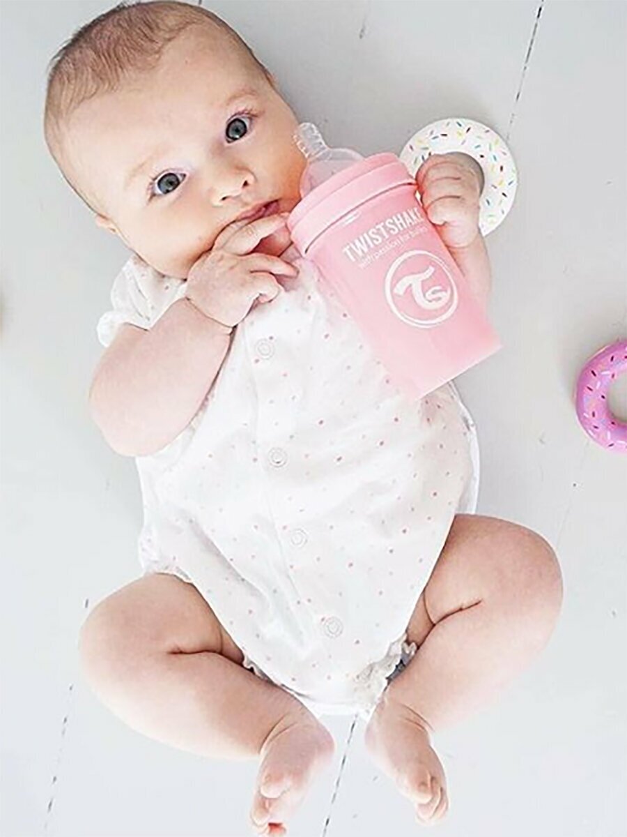 Бутылочка Twistshake с контейнером для сухой смеси и соской 0+. Современные родители, которые хотя бы раз сталкивались с приготовлением молочной смеси для малыша знают, что добиться однородности и отсутствия комочков в смеси очень нелегко. Twistshake решает эту проблему раз и навсегда. Уникальная особенность бутылочек Twistshake - наличие специального шейкера, который тщательно разбивает молочную смесь. Все бутылочки Twistshake имеют антиколиковые соски, специальный клапан которых предотвращает попадание лишнего воздуха и снижает вероятность возникновения колик у малыша. В комплекте каждой бутылочки имеется контейнер для сухой смеси. Он незаменим в дороге, ведь смесь нужно готовить непосредственно перед употреблением, а не заранее. Также контейнер можно использовать и для транспортировки детского питания или снеков. Баночки соединяются между собой, что экономит место и очень нравится детям. Бутылочки Twistshake выполнены в ярких сочных цветах. Поэтому это не только необходимый аксессуар для кормления ребенка, но и модный атрибут образа мамы. А как понравятся подрастающему и сделавшему первые шаги ребенку эти лиловые, зеленые, голубые и оранжевые оттенки! Все бутылочки и соски Twistshake соответствуют европейскому стандарту качества EN-14359. В комплекте: бутылочка объемом 180 мл с соской для новорожденных 0+, контейнер для хранения сухой смеси объемом 100 мл. Особенности: Соски исключительно физиологичны благодаря широкой форме и ребрам жесткости; Специальный клапан исключает попадание лишнего воздуха во время кормления, снижая вероятность возникновения колик у детей; Бутылочки представлены в объемах 180, 260 и 330 мл; Фильтр для лучшего растворения смеси и разбивания комочков; В комплекте контейнер для хранения сухой смеси объемом 100 мл; Крышечка для чистоты и гигиены соски; Не содержит Бисфенол А.