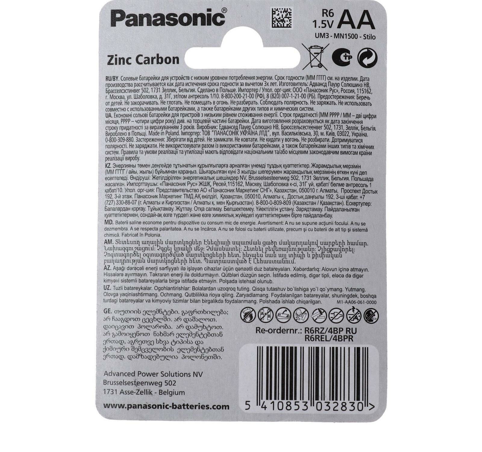 Батарейка Panasonic R6 AA BL4 Zinc Carbon 1.5V (4/48/240).Батарейки Panasonic надежно обеспечивают стабильную работу Ваших устройств, а также обладают выгодным соотношением экономичности и качества в отличие от других производителей.Panasonic R6 AA - серия экономичных и надежных солевых батареек для устройств с низким уровнем потребления энергии.