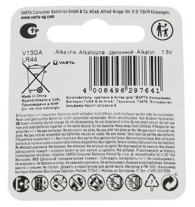 Батарейки VARTA BLI 1 ALKALINE стоят у меня в часах и калькуляторе очень давно: как установил год назад, так и пользуюсь до сих пор. А самое важное, что находясь в брелоке на сигнализацию, такая батарейка не подведет, что очень важно. Продаются они по одной штуке, в надежной упаковке. Обошлись довольно дешево. Недавно проверял их состояние - никакого окисления не было замечено. Ржавчине они также не подвержены. Размеры указанные в характеристиках на товар, полностью соответствовали действительности. Менеджер с этой интернет-площадки мне их уверительно порекомендовал. Как и всегда, заказал товар здесь.