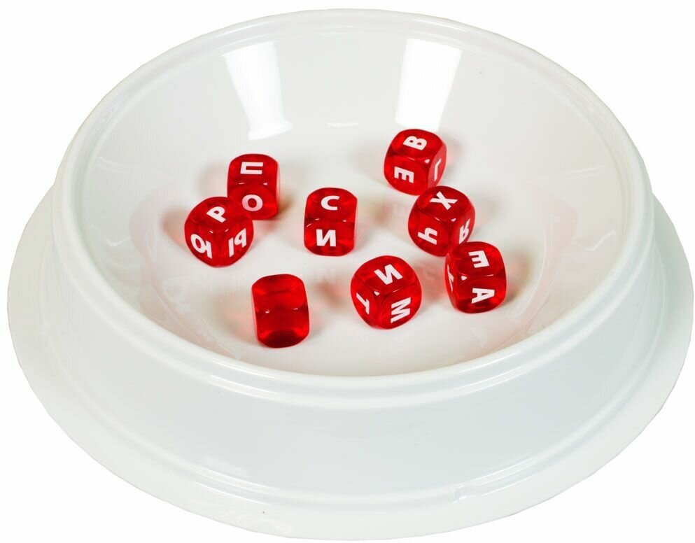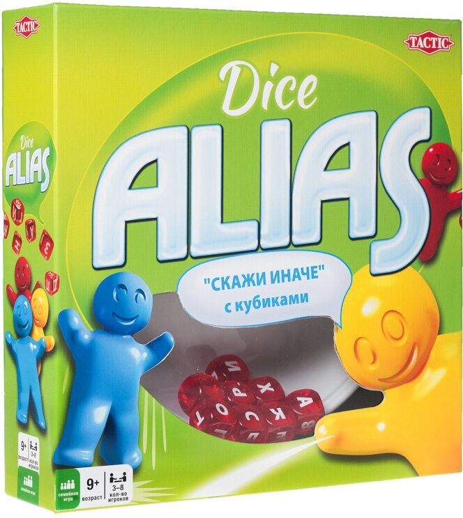 Теперь на всех игроков лишь 8 кубиков с буквами! Поэтому не забывайте о быстроте реакции и скорости мысли, так как игра стала более конкурентной. Игрокам предстоит как можно скорее собирать слова из кубиков, если они хотят выиграть.Как играть?Как и любая другая игра Алиас, версия Алиас с кубиками основана на объяснении слов при помощи антонимов, синонимов, метафор и прочих всевозможных фраз, кроме однокоренных слов. Но механика в этой настолке стала куда интереснее.Каждая партия начинается с того, что вы бросаете в специальную чашу все кубики. Далее у вас и ваших товарищей будет всего 30 секунд, чтобы из выпавших букв составить слово. При этом каждую букву можно использовать только один раз, а кубик Джокера заменяет любую букву. Игрок, первым составивший свое слово, быстро выкрикивает «Алиас» и приступает к объяснению своего загаданного слова. Участник, угадавший это самое слово, и участник, который его придумал, передвигают свою фишку на одно деление вперед.Ваша цель - это прийти к финишу самым первым, а для этого вам понадобится вся ваша скорость, внимание и сообразительность.Кстати, партию можно немного усложнить при помощи специальных досок с категориями слов. Если вы составили слово, которое подходит выбранной категории, то сможете сделать дополнительный шаг на игровом поле.