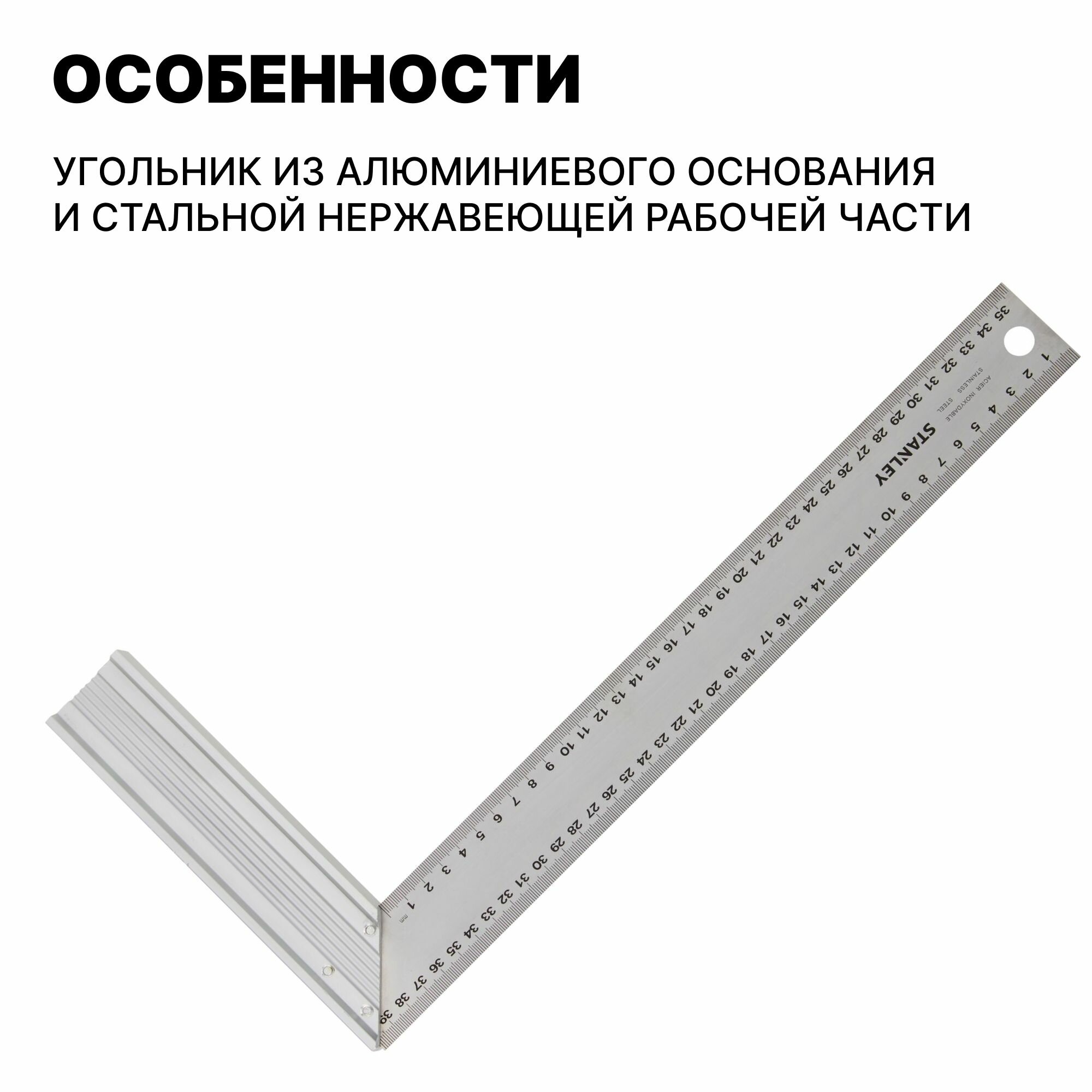 Угольник Stanley (200х400mm) предназначен для проведения столярных работ - точного измерения различных поверхностей и деталей. Инструмент сочетает в себе алюминиевое основание и мерительное полотно из нержавеющей стаи. Шкала легко читается, она глубоко выгравирована по технологии "GRAVEMAT", что снижает уровень ее истирания даже при частом и интенсивном использовании угольника.