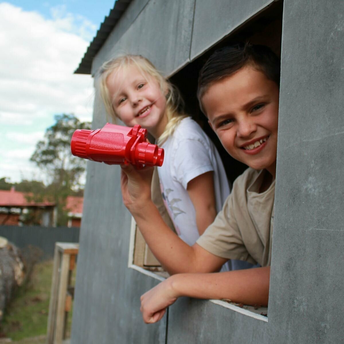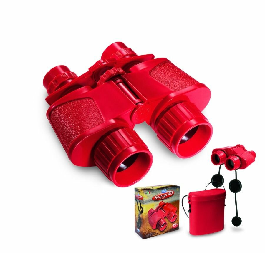 Бинокль из красного матового пластика. Увеличение в 3,5 раза, регулировка фокуса и межзрачкового интеравала 49-78 мм. Диаметр объектива 40 мм; оптика - 4 элемента. Ремешок для ношения на фиксаторе. Заглушки на окуляры. Оптика выполнена из оргстекла Plexiglas. Материал корпуса - ABS пластик. Бинокль компактный, удобно играть и брать с собой. Размер: 16,5x18x7 см, вес 600 гр. Возраст: 5+.
