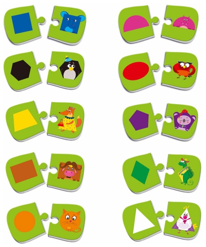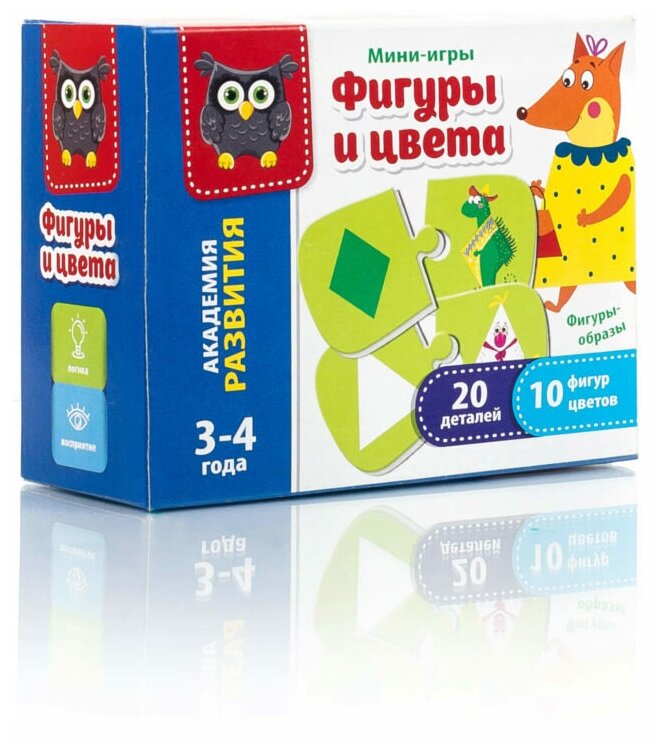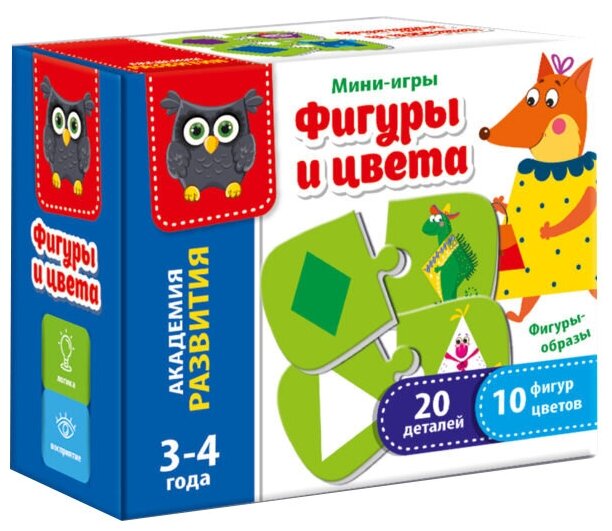 Игра развивает логическое мышление, внимание, даёт базовые знания о цветах и формах.Разложите пазлы-парочки перед ребёнком. С одной стороны стола положите все картинки, с другой – разместите разноцветные фигуры. Покажите малышу картинку: лисичка в платьице-трапеции. Пусть ребёнок выберет и присоединит деталь с изображением соответствующей фигуры. Спросите, какого цвета эта фигура? Малыш точно скажет, что она жёлтая. Сложите все пазлы-парочки. Проговаривайте название каждой формы и цвета.Возраст: 3-4 года.Комплектация: 20 деталей (10 фигур/цветов).упаковка коробкаразмер упаковки 128x100x55 ммстрана изготовления Украинавозраст 3-4 гартикул у производителя VT5111-04вес 300 г
