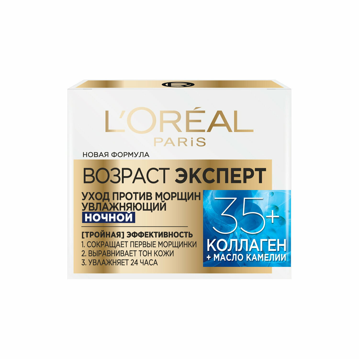 Описание товара:«Возраст Эксперт» от Лореаль Париж — это гамма средств, направленная на удовлетворение потребностей кожи разных возрастов. Основная проблема кожи после 35 лет — это понижение уровня коллагена, как следствие — появление морщин. Ночной крем для лица «Возраст Эксперт 35+» эффективно борется с первыми признаками старения. Формула крема повышает упругость кожи и интенсивно разглаживает морщины благодаря биосферам коллагена, которые проникают в глубинный слой эпидермиса.Состав товара:Aqua/water, cyclohexasiloxane, glycerin, butyrospermum parkii butter/shea butter, isohexadecane, pentaerythrityl tetraethylhexanoate, dipropylene glycol, cera alba/beeswax, stearic acid, palmitic acid, cyclopentasiloxane, acrylamide/sodium acryloyldimethyltaurate copolymer, peg-100 stearate, stearyl alcohol, glyceryl stearate, peg-20 stearate, glycine soja oil/soybean oil, dimethiconol, manganese gluconate, sodium chondroitin sulfate, sodium hydroxide, atelocollagen, disodium edta, propylene glycol, pentaerythrityl tetraisostearate, soluble collagen, boswelia serrata extract/boswellia serrata extract, polysorbate 80, tocopherol, methylparaben, phenoxyethanol, linalool, alpha-isomethyl ionone, hydroxyisohexyl 3-cyclohexene carboxaldehyde, citronellol, butyl-phenyl methylpropional, hexyl cinnamal, benzyl alcohol, benzyl salicylate, parfum/fragrance, potassium sorbate.Меры предосторожности:Хранить в недоступном для детей месте. Не употреблять внутрь.Способ применения:Рекомендуется наносить каждый вечер на предварительно очищенную кожу лица и шеи лёгкими массажными движениями.