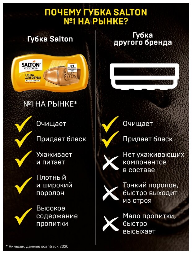 Губка Salton в форме волны выполнена из упругого и высокого поролона, что не позволяет пластиковым краям корпуса царапать поверхность обуви. Корпус губок плотно прилегает к поролону и надежно смыкается при закрывании, что не дает пропитке быстро высохнуть и увеличивает срок службы изделий. Благодаря содержанию норкового масла и натурального воска ланолина, пропитка этих средств для обуви увлажняет, смягчает и защищает от загрязнений кожаную поверхность обуви. Позаботьтесь о чистоте и защите Вашей любимой обуви с губками Salton.