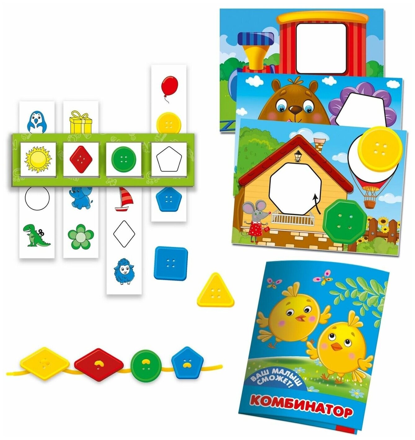 Мамы и малыши знают, что заниматься и познавать новое всегда интереснее в легкой игровой форме.Развивающая игра "Комбинатор" от компании Дети "Vladi Toys" подарит малышам радость, они с удовольствием будут выкладывать пуговки по картинкам, внимательно выбирая соответствующую форму и цвет.Комплект: 11 карточек, 10 maxi пуговиц, шнурок, комбинатор, инструкция.Возраст: от 1 до 3 лет.Материал: картон, текстиль, пластик.