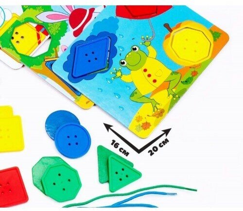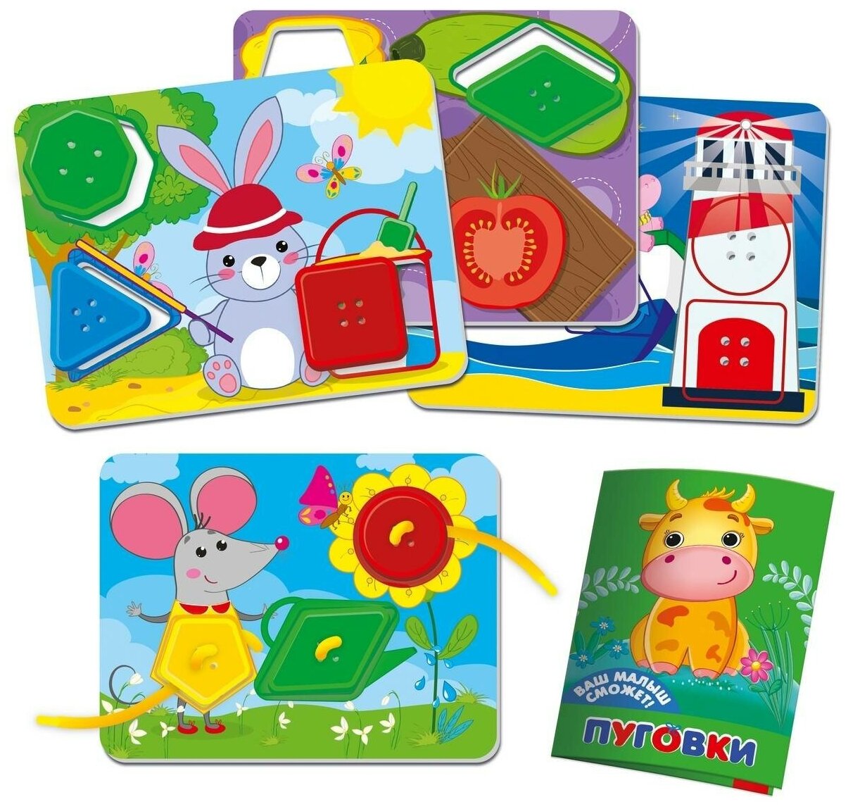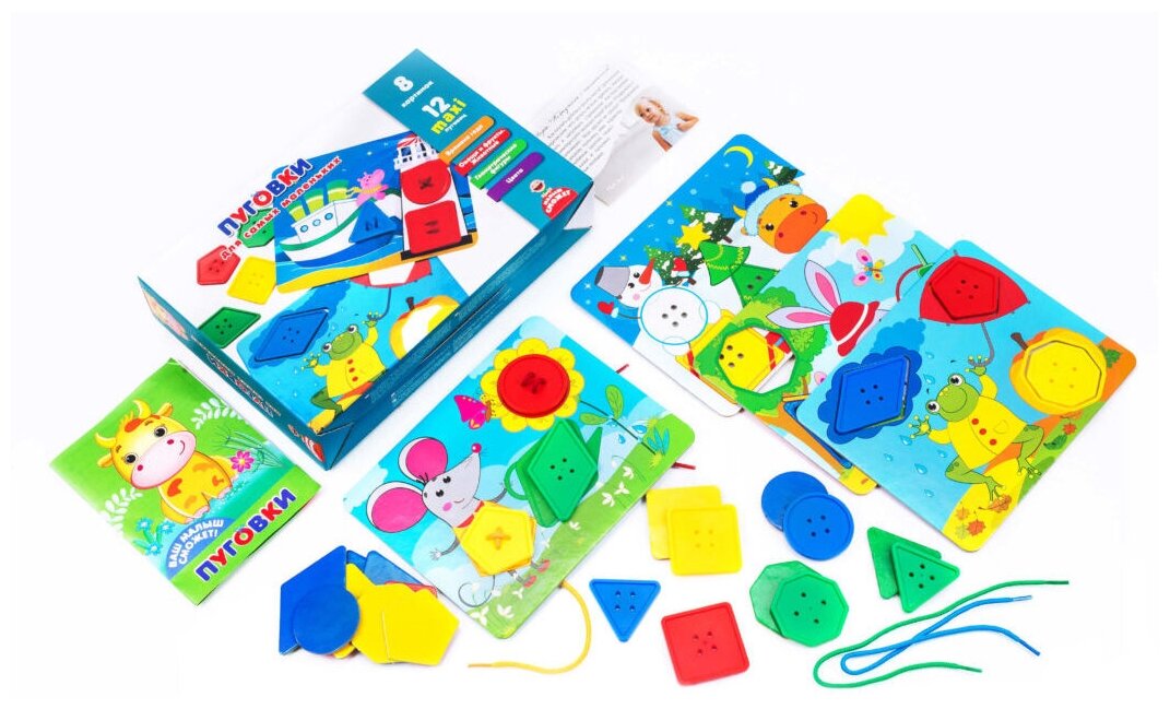 Покупкой довольна. Картон плотный, цвета яркие. Можно придумать много игр для ребенка. Плюс сама упаковка с ручкой - сын носит ее как чемоданчик. Хотелось бы больше шнурков. Их всего четыре, а мест для шнуровки и пуговиц больше. Но эту проблему легко исправить самостоятельно.