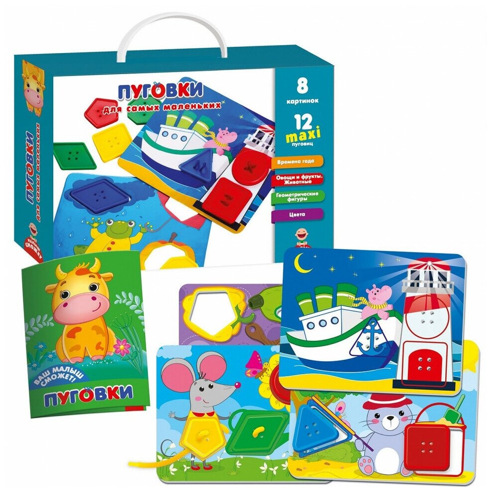 Vladi toys Развивающая игра Пуговки для самых маленьких Изучайте геометрические фигуры и цвета в интересной игровой форме! Разложите перед ребенком картонные поля и пуговицы. Пускай малыш внимательно рассмотрит их. Часть полей содержит нарисованные контуры геометрических фигур. Малыш должен найти пуговицу соответствующей формы и цвета и прикрепить её к полю с помощью шнурка. На остальных карточках есть отверстия. На их место нужно вложить пуговицу соответствующей формы. Красочные изображение сделают процесс игры еще более увлекательным и помогут малышу изучит фрукты, овощи, животных и транспорт. Игра также тренирует логическое мышление, мелкую моторику, внимательность и речь.