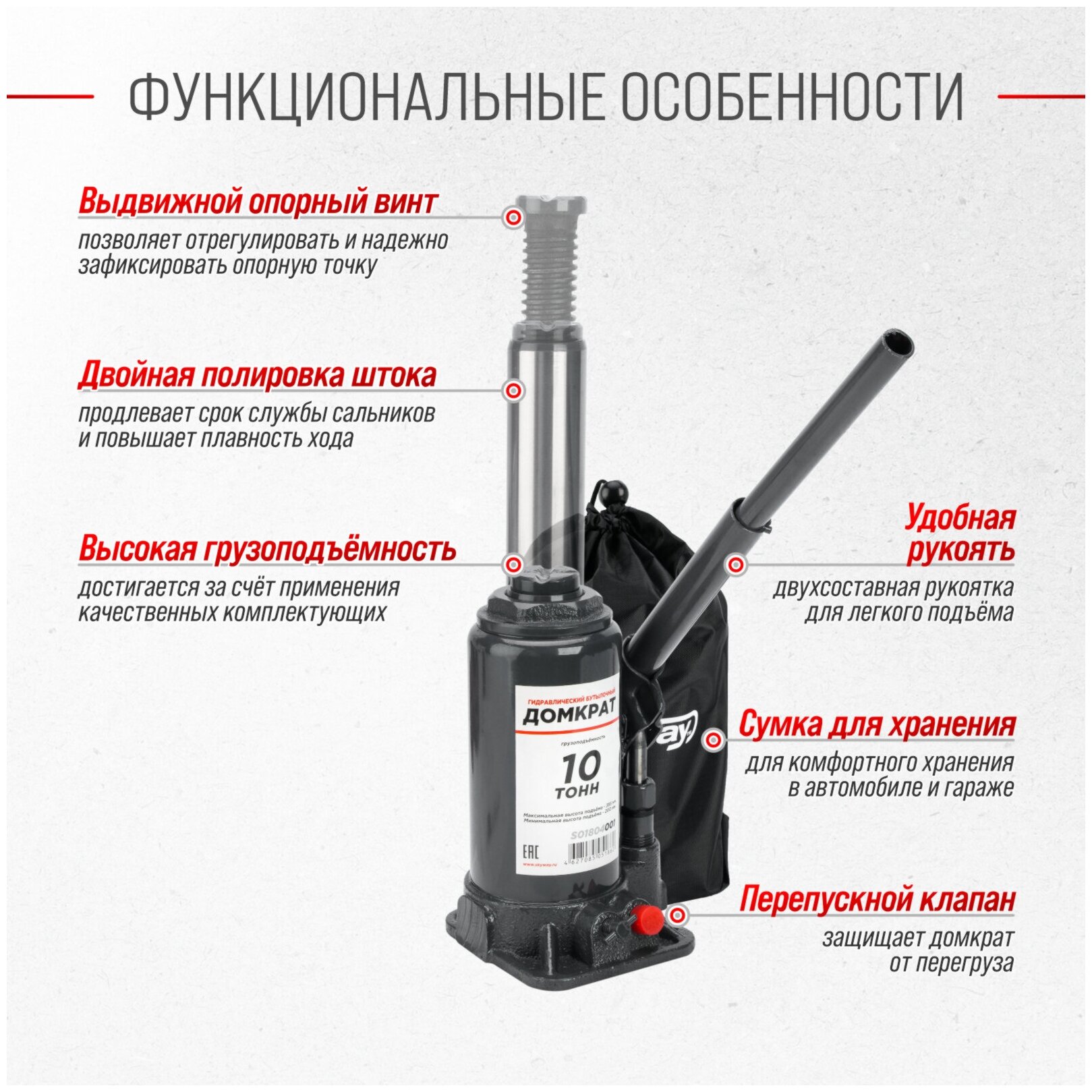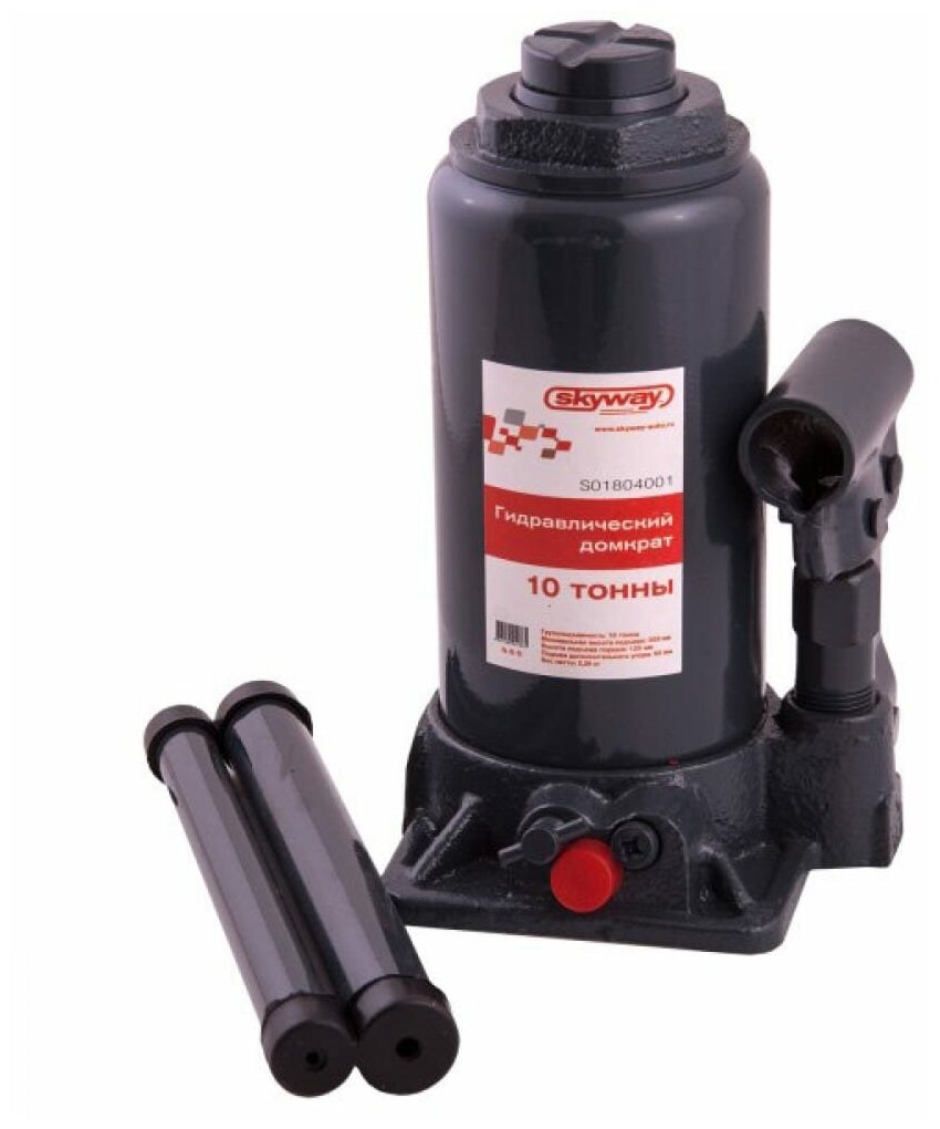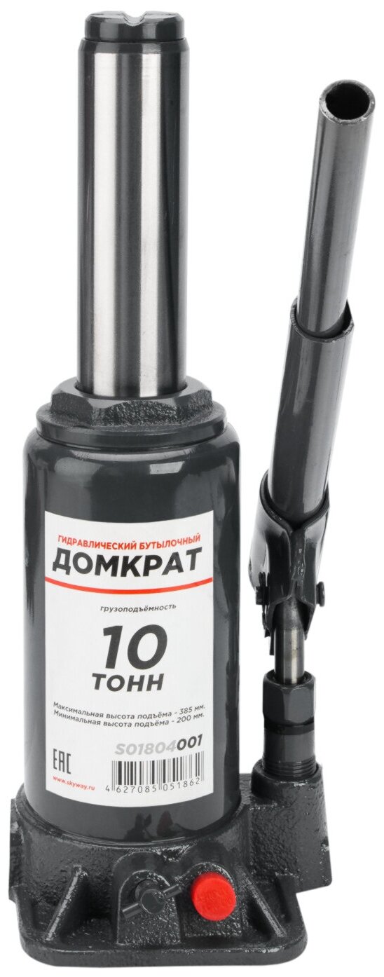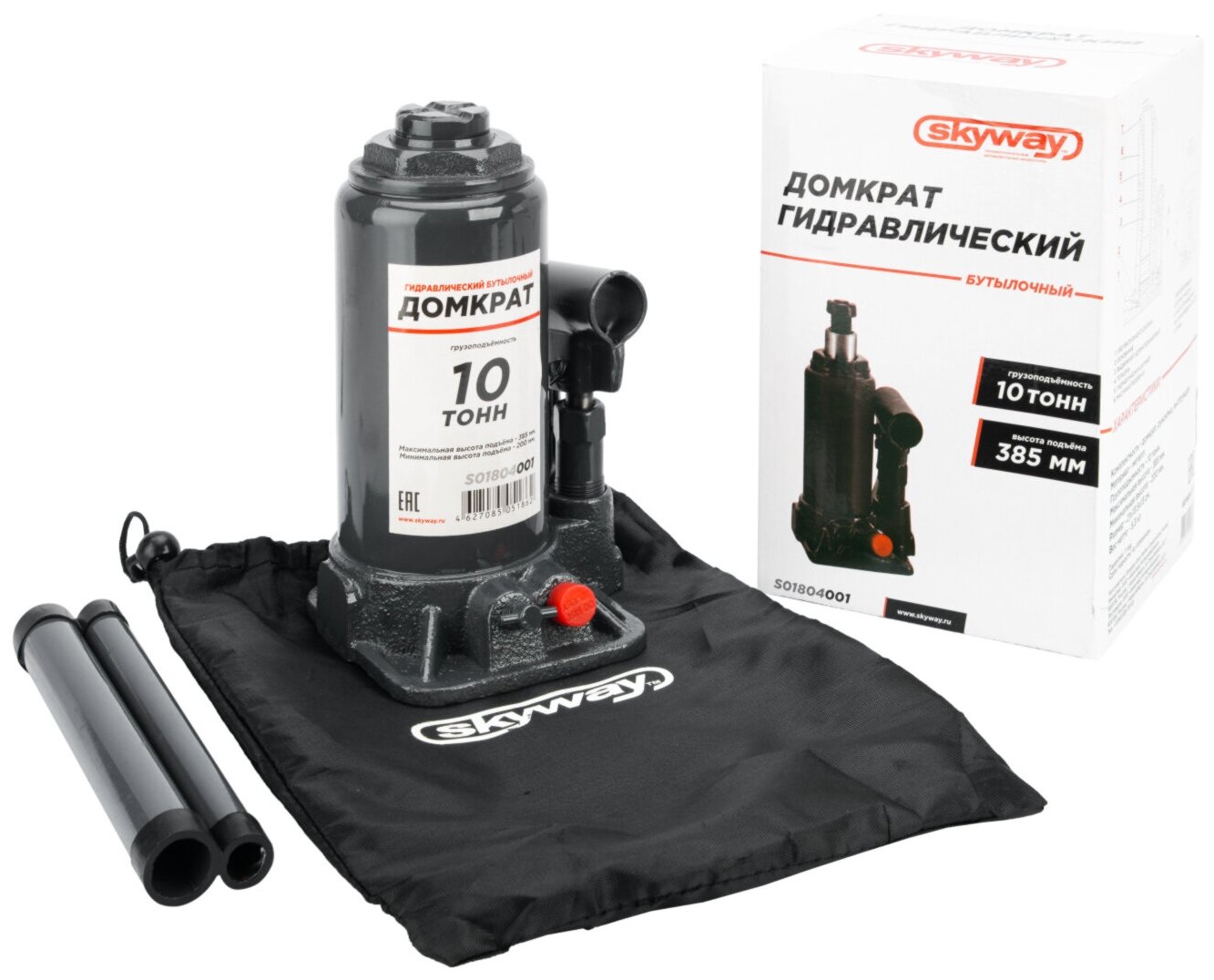 Домкрат гидравлический бутылочный 10т h 200-385мм SKYWAY с клапаном в коробке-полностью металлическая конструкция узлов и агрегатов обеспечивает высокую надежность и отказоустойчивость. Перепускной клапан предохраняет домкрат от поломки, если вес груза превышает грузоподъемность домкрата.