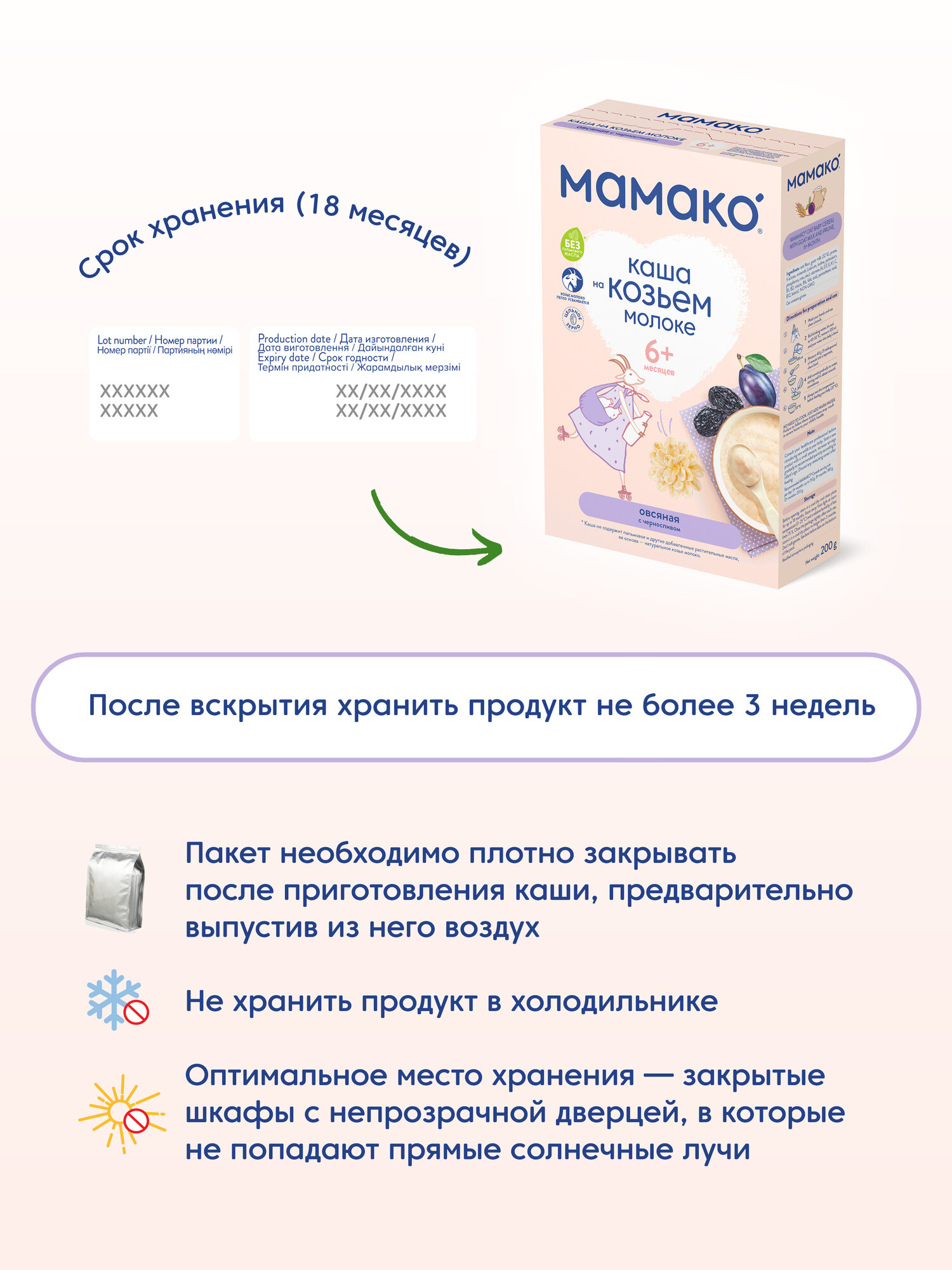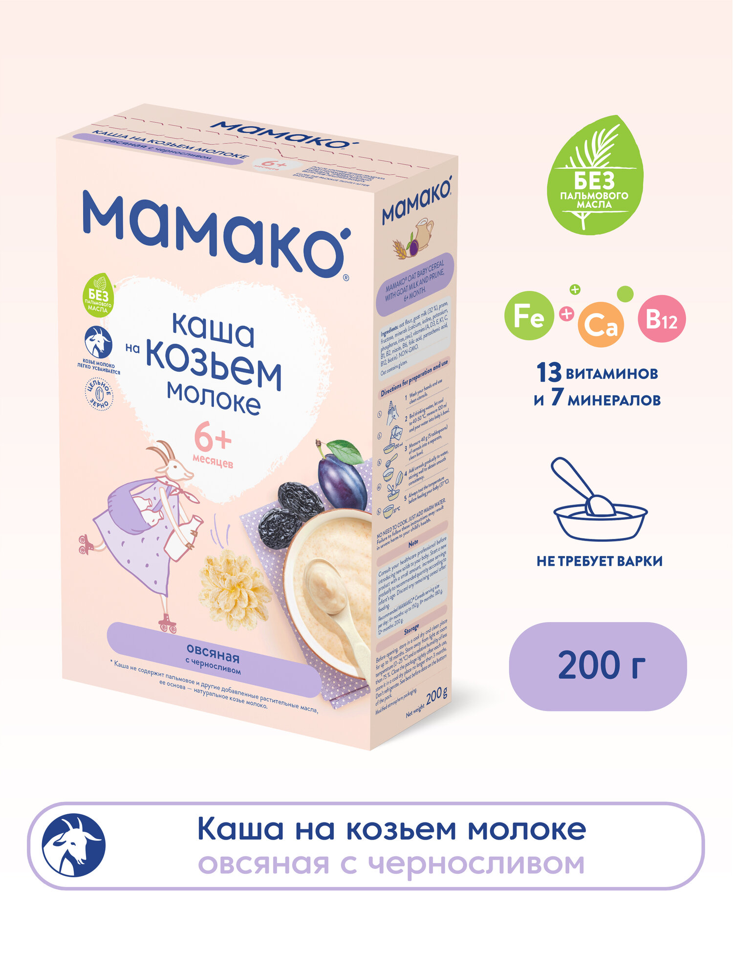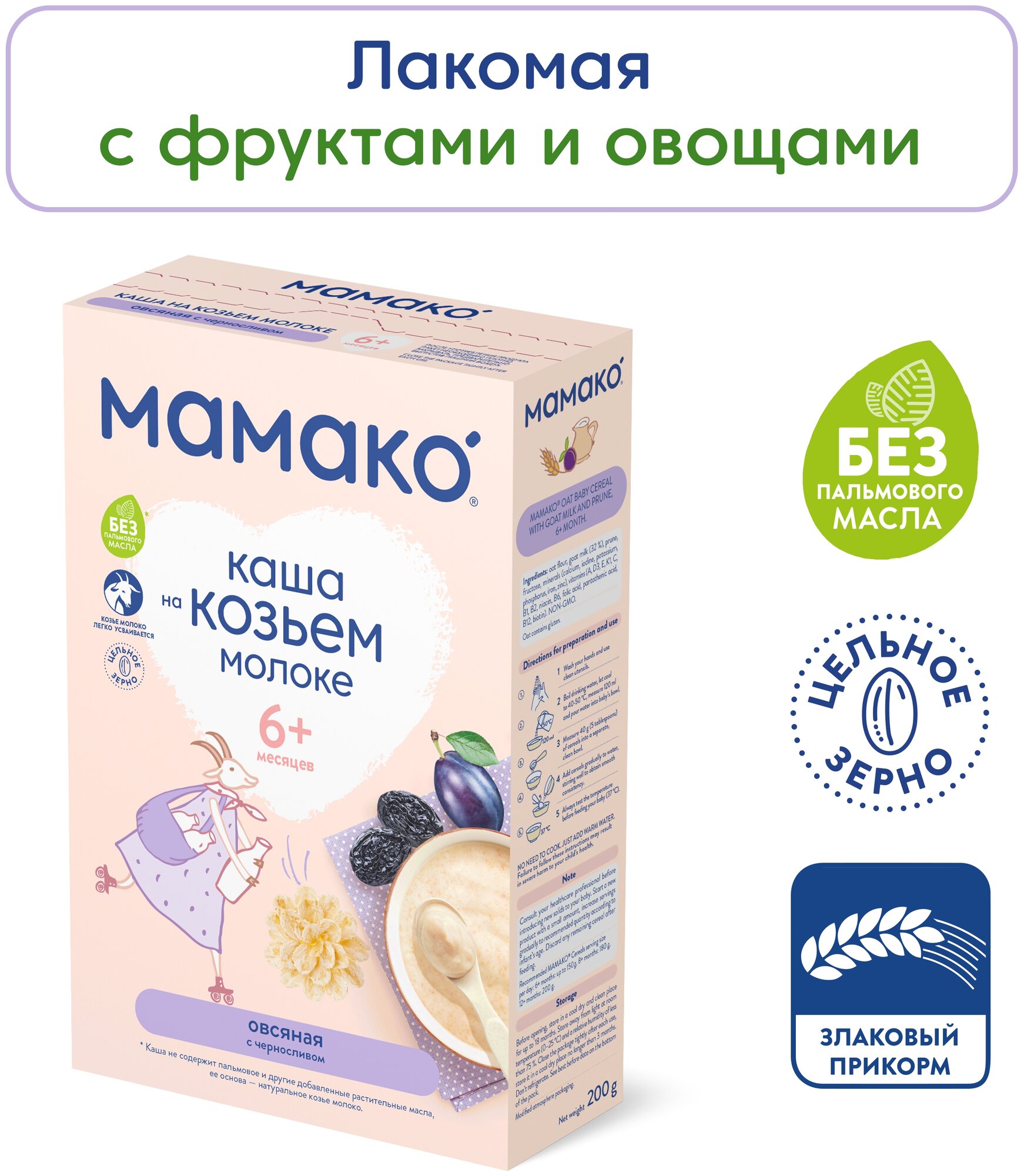 Каша МАМАКО® овсяная с черносливом на козьем молоке с 6 мес, 200 грКаши мамако' станут настоящей находкой для тех родителей, чьи дети имеют непереносимость белков коровьего молока! Ведь растущему организму нужны белки, энергия – все, что не могут полноценно заменить каши на безмолочной основе или на основе гидролизатов белка.