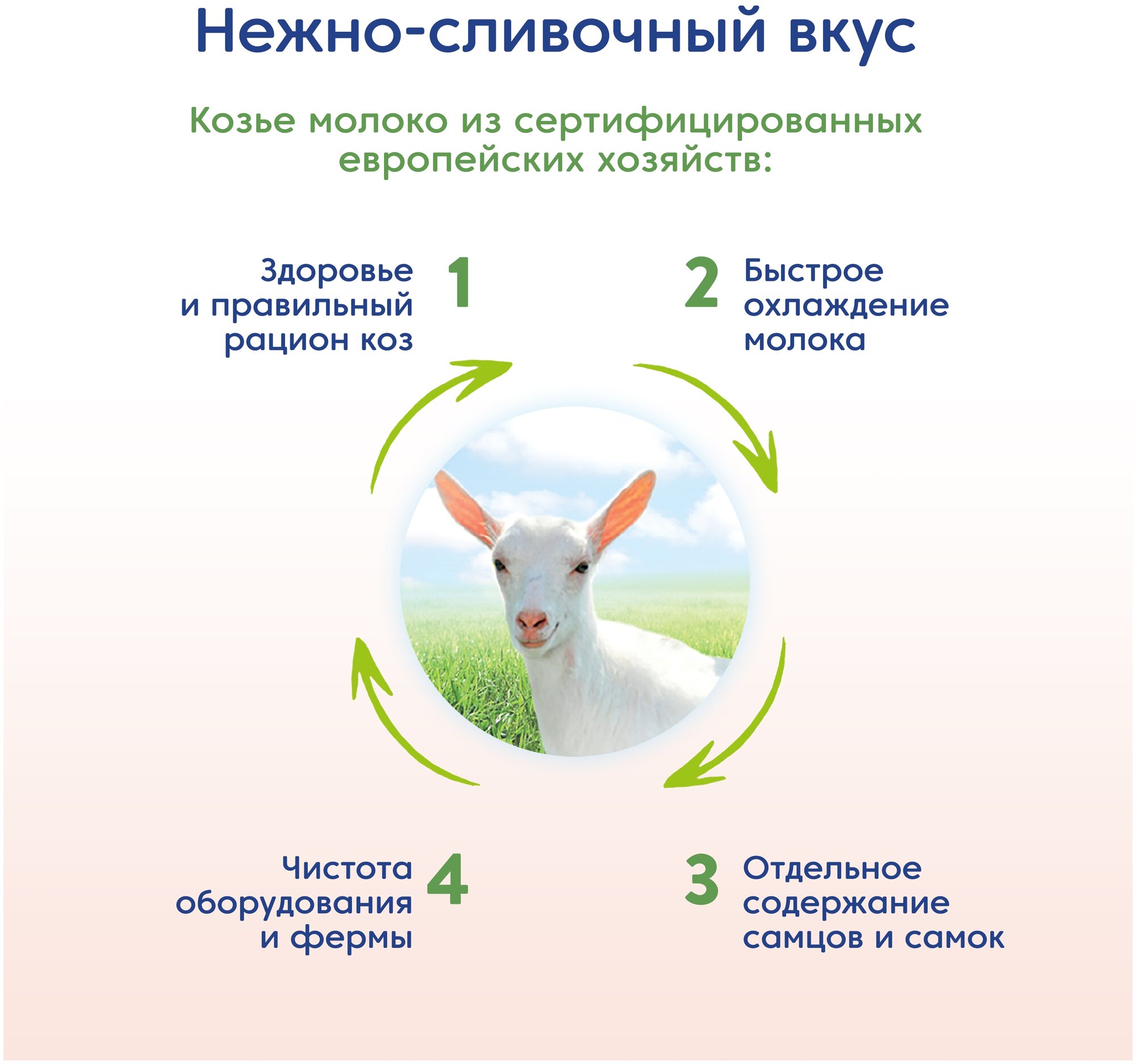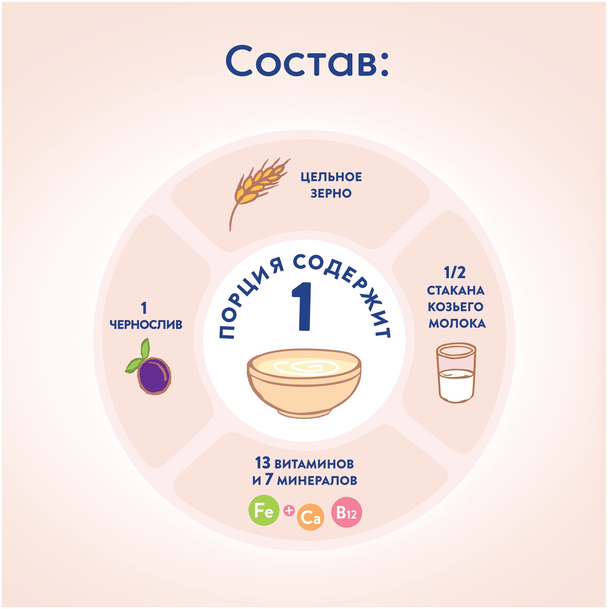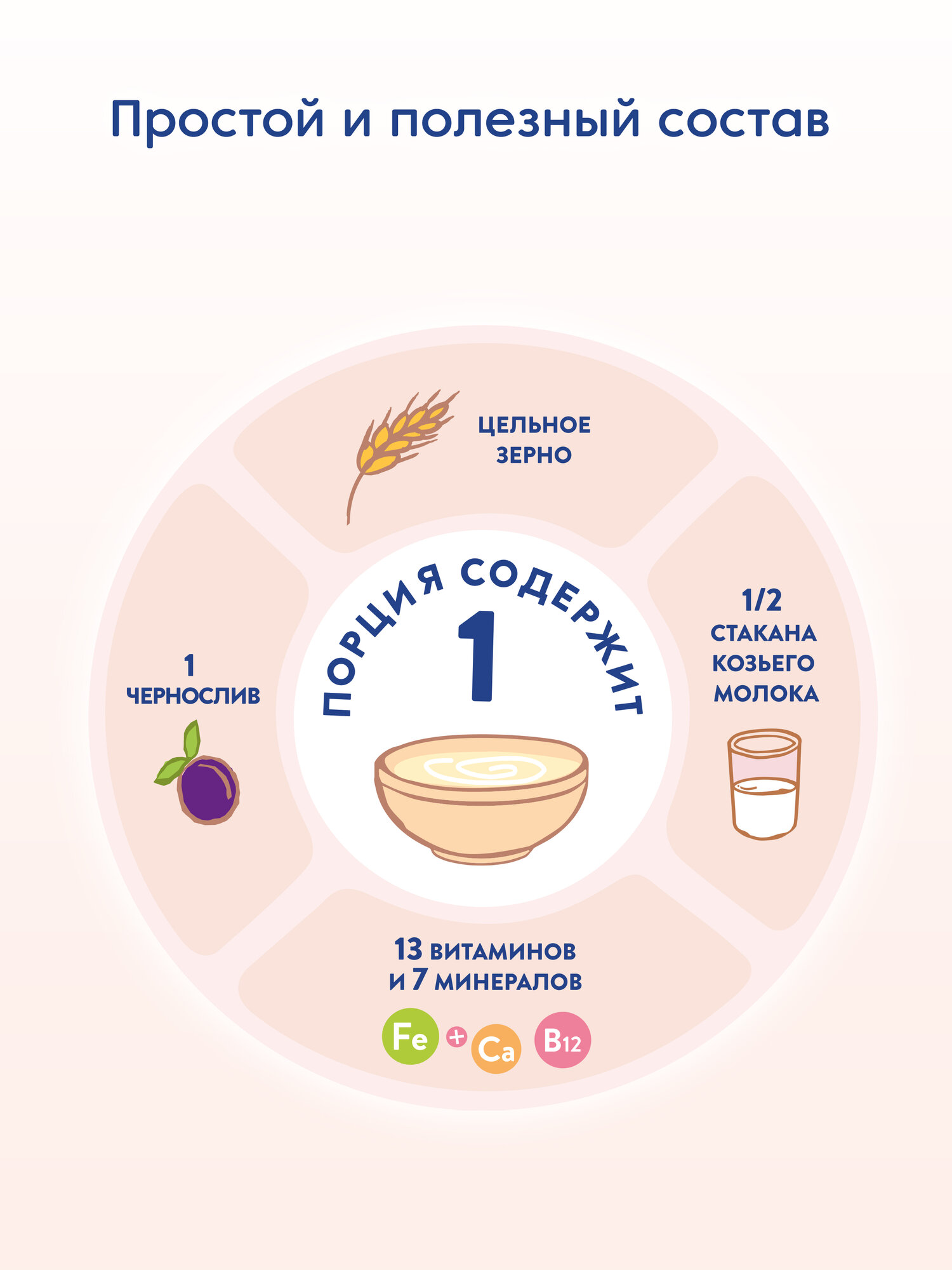 | Состав | овсяные хлопья (измельченные), козье молоко (32%), чернослив, фруктоза, комплекс минералов (карбонат кальция, пирофосфат железа, йодид калия, сульфат цинка), комплекс витаминов (A, D, E, K, C, B1, B2, B6, B12, ниацин, фолиевая кислота, пантотеновая кислота, биотин), лимонная кислота |