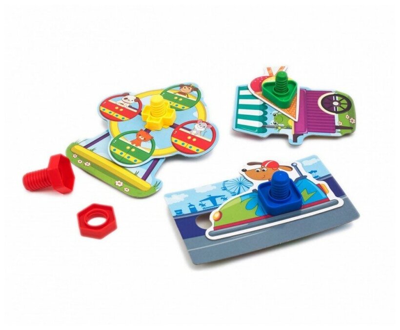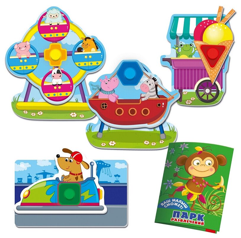 Vladi toys Развивающая игра Парк развлечений для самых маленьких Дружные зверушки отправляются в парк развлечений и зовут малыша с собой! Разложите перед ребенком картонные фигуры аттракционов и зверушек. Пускай он рассмотрит их и определит кто где будет кататься. Далее с помощью болта и гайки нужно правильно соединить картонные детали. Стоит быть внимательным. Болт нужно подобрать правильной формы. Ура! Они двигаются. Теперь зверушки могут кататься на качелях! Детали двухсторонние. На каждой из сторон изображен новый сюжет. Благодаря прочному картону они не гнутся и не портятся. Игра тренирует логическое мышление, мелкую моторику, память и речь.