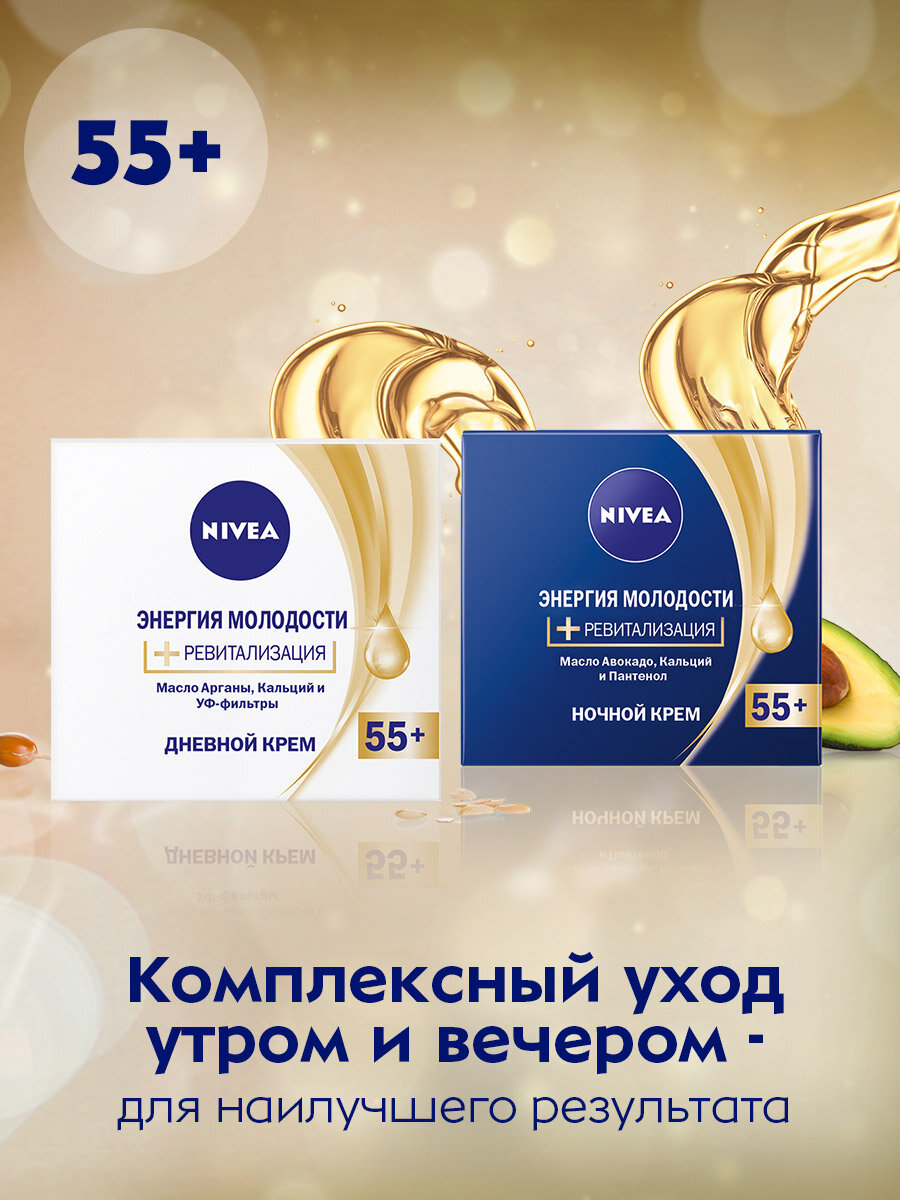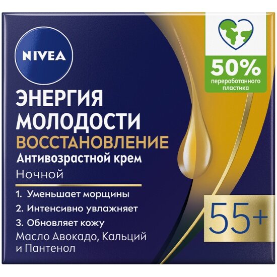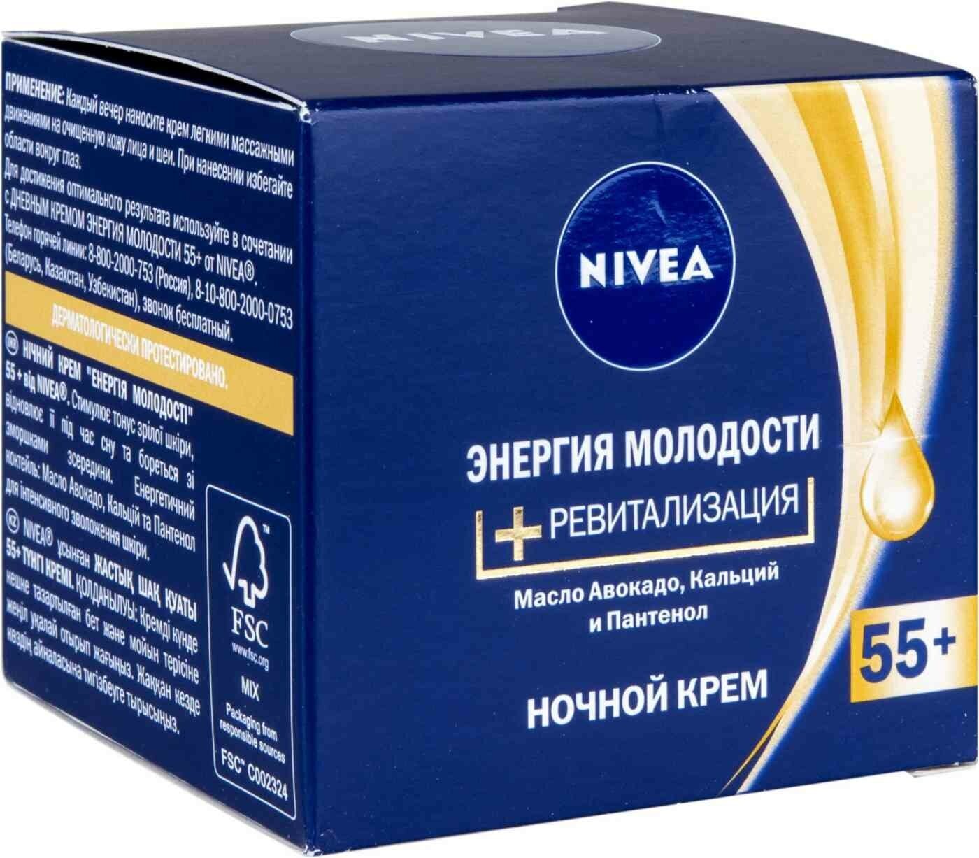 Крем для лица Nivea Энергия Молодости 55+ — ночной антивозрастной уход, заметное обновление и упругость кожи уже через 4 недели, объём 50 мл.