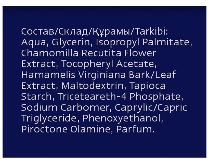 | Состав | Aqua, Glycerin, Isopropyl Palmitate, Chamomilla Recutita Flower Extract, Tocopheryl Acetate, Hamamelis Virginiana Bark/Leaf Extract, Maltodextrin, Tapioca Starch, Triceteareth-4 Phosphate, Sodium Carbomer, Caprylic/Capric Triglyceride, Phenoxyethanol, Piroctone Olamine, Parfum. |