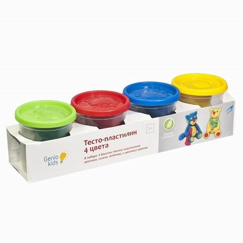 Комплектность набора: 4 баночки с тесто-пластилином (синего, зеленого, красного и желтого цветов).