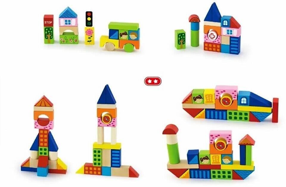 Разноцветный конструктор-городок с разрисованными деталями. Играя, ребенок сможет построить много разных зданий различных по форме. Конструктор надолго займет ребенка. Он стимулирует воображение, логику, фантазию, улучшает пространственную координацию, позволяет малышу играть без ограничений. Набор состоит из деревянных деталей цилиндрической, треугольной и квадратной формы – этого достаточно, чтобы сложить забор, ограждение, лесенку. Яркая, красочная позитивная игрушка из натуральной древесины приятна на ощупь и позволяет воплотить в жизнь множество замечательных идей. С этим конструктором малыш сможет постичь азы архитектуры.