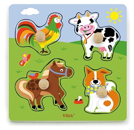 Рамка-вкладыш Viga Toys Животные на ферме - это интересная игрушка, которая будет служить не только традиционным пазлом, но и полезным инструментом для тренировки зрительно-двигательной координации, логического мышления и изучения названий некоторых животных. Развивающая игрушка подходит для занятий по методике Монтессори. Рекомендована для игр дома, в детских садах и центрах развития.Особенности рамки-вкладыша:- головоломка состоит из 4-х вкладышей в виде петушка, коровки, лошадки, собачки и рамки с выемками;- ребенку необходимо понять куда и каким образом вставить фигурку, увидеть связь между частями и целым;- внутри каждой выемки изображен контур животного, который поможет малышу сделать правильный выбор;- рукоятка поможет держать и переносить вкладку, не спутав лицевую сторону с оборотом.Составляющие игрушки выполнены из экологически чистого сертифицированного бука и окрашены нетоксичными красителями. Все края сглажены, а поверхности тщательно отшлифованы.