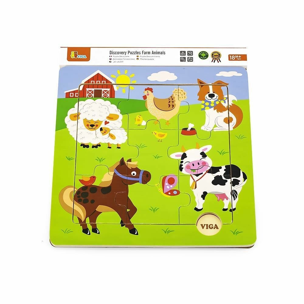 Деревянный пазл Viga Toys Зверята на ферме – это развивающая игрушка в виде пестрой тематической картинки с веселыми персонажами. Предназначен пазл для малышей от 18 месяцев.Головоломка состоит из 9 составных элементов и основы, на которую нанесен рисунок-подсказка. Малыш будет собирать картинку с классическим детским сюжетом: на ней домик, солнце, облака, зеленая лужайка и беззаботно гуляющие зверята. Здесь есть курочка с цыплятами, овечка с ягненком, лошадка, коровка и собачка.Собирая такой деревянный пазл, ребенок с легкостью запомнит названия домашних животных, расширит кругозор и восприятие цветов. Кроме того, малыш улучшит мелкую моторику, научится координировать глаза и руки. Он станет более внимательным, сообразительным. Начнет мыслить шире, видеть связь между частями и целым. Развивающий пазл подходит для занятий по методике Монтессори. Рекомендован для детских садов и центров развития.