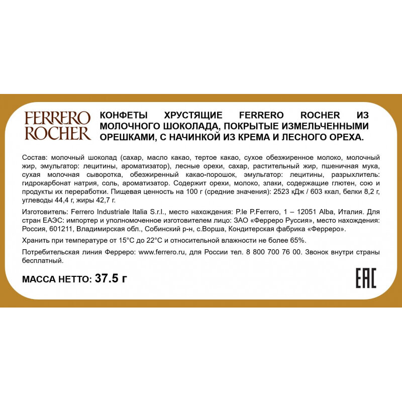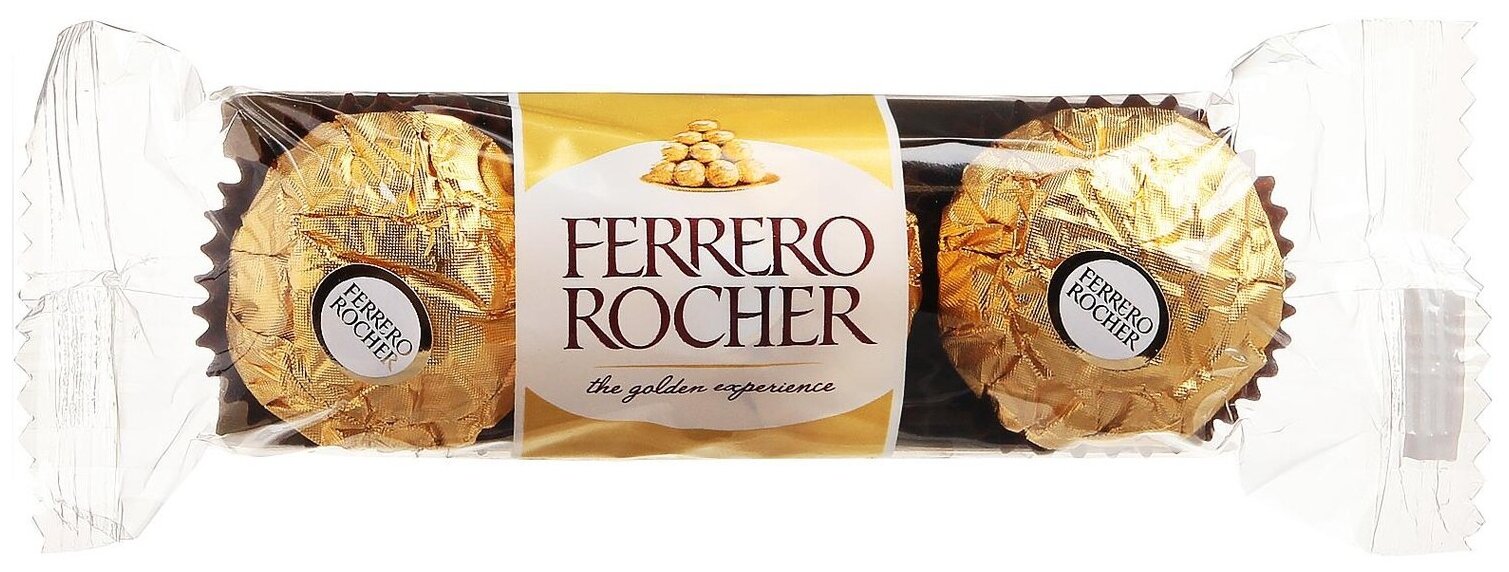 Конфеты хрустящие Ferrero Rocher из молочного шоколада, покрытые измельченными орешками, с начинкой из крема и лесного ореха.В упаковке 3 конфеты Ferrero Rocher.