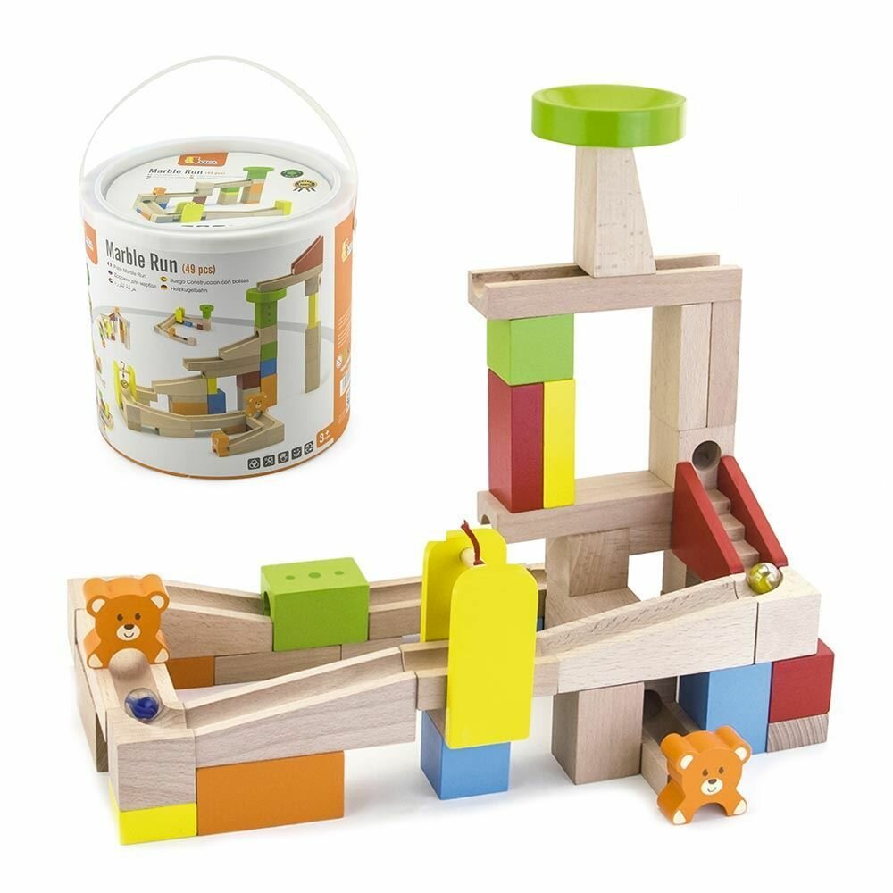 Конструктор Viga Toys (Вига Тойс) Занимательные горки состоит из строительных блоков, которые изготовлены из натуральной древесины. Ребенок сможет наблюдать, как шарик двигается и прыгает по лабиринту. В комплекте есть схематическая инструкция, которая поможет построить десять разных вариантов лабиринтов: простые конструкции для начинающих и более сложные - для умелых мастеров. Игрушка создана из натуральной древесины, которая не содержит вредных составляющих.