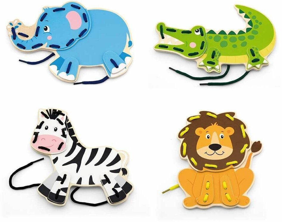 Шнуровка Viga Toys (Вига Тойс) Дикие животные – это набор, который содержит детали четырех различных животных. Детали нужно соединить при помощи четырех шнурков разного цвета. Шнуровка выполнена в ярких цветах, из высококачественной древесины Игрушка безопасна для здоровья Игра со шнуровкой поможет развить мелкую моторику, мышление, внимание