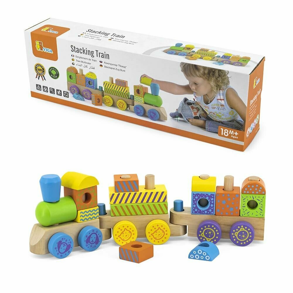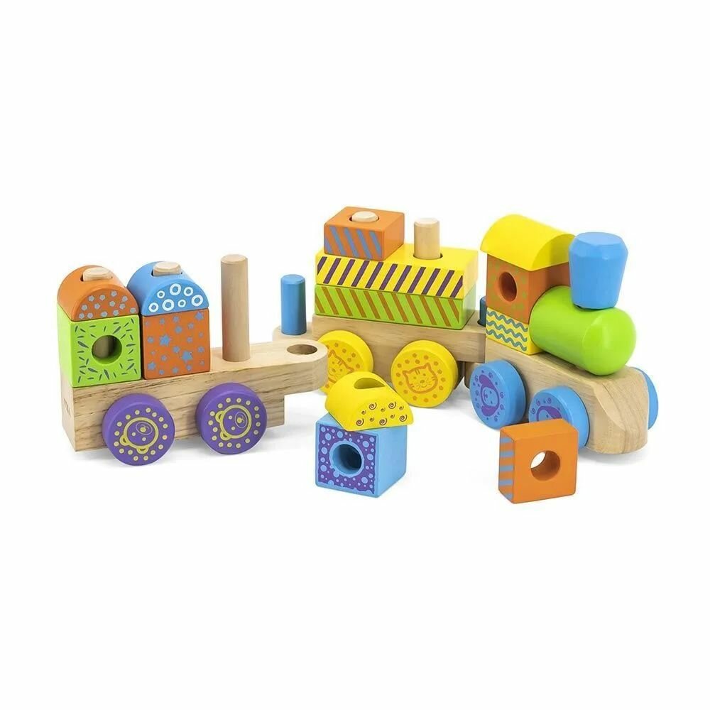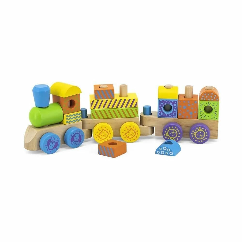 Три деревянные платформы, оснащенные подвижными колесами и соединяющиеся между собой специальными креплениями, образуют паровозик, который кроха с удовольствием будет катать. Изюминкой является то, что малыши смогут на свое усмотрение создавать красивые вагончики при помощи ярких разноцветных деталей различных форм, надеваемых на специальные колышки, установленные на платформах. Все элементы необычного конструктора изготовлены из тщательно отшлифованного дерева и покрыты нетоксичными красками.
