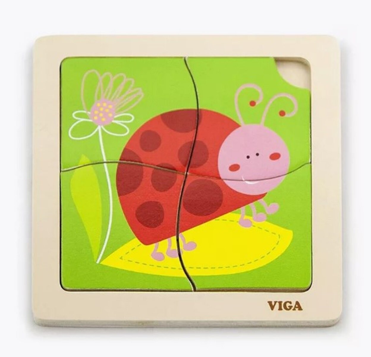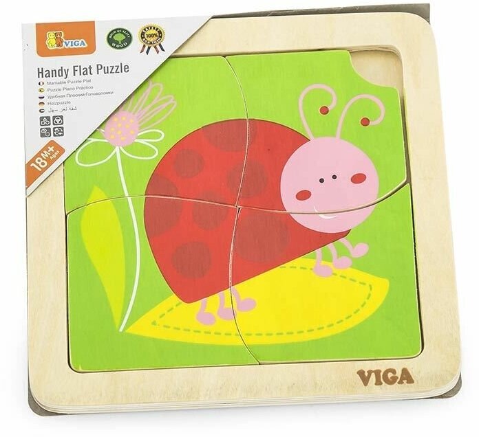 Простой классический пазл-вкладыш Viga Toys Божья коровка рассчитан на малышей в возрасте от 18 месяцев. Набор содержит 4 цветных фрагмента картинки с забавной божьей коровкой и рамку для их закрепления. Собирая тематическое изображение, малыш тренирует координацию рук и глаз, развивает воображение, творческое и логическое мышление.Составляющие набора выполнены из экологически чистого сертифицированного бука и окрашены нетоксичными красителями. Все их края сглажены, а поверхности тщательно отшлифованы. Продукция отвечает стандартам качества и безопасности детских игрушек.