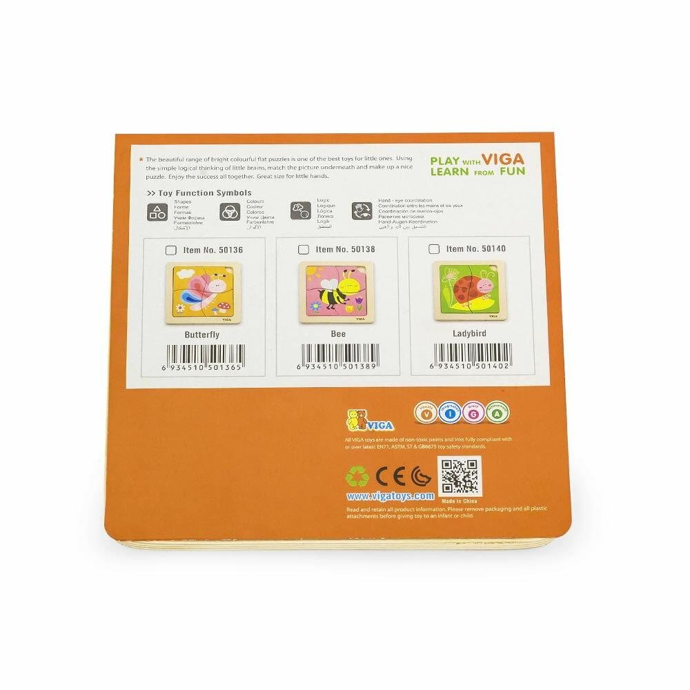 Что подарить ребенку, который еще не умеет играть- Начните с самого простого пазла. Он поможет малышу почувствовать уверенность в своих силах, подготовит его к более сложным развивающим играм. Деревянный мини-пазл Viga- Пчелка из 4 элементов разработан для детей от 18 месяцев и заслуживает стать первой развивающей игрушкой ребенка. Головоломка красочная, с крупными деталями и простым рисунком в виде полосатого насекомого. Благодаря рисунку-подсказке на квадратной основе ребенок легко соберет такой пазл, быстро научится соотносить части и целое. Регулярно упражняясь в подобных занятиях, малыш станет более внимательным, сосредоточенным, любознательным. Складывание пазлов развивает мышление, в том числе логическое и образное, память, моторику рук и тактильные ощущения. Эта деревянная игрушка отлично сочетается с методикой Монтессори, рекомендована для детских садов и центров развития. Все деревянные элементы гладкие, тщательно отшлифованные, прочные. Благодаря крупному размеру они идеально подходят для маленьких рук. Мини-пазл Пчелка, как и все товары Viga-Toys, выполнен в соответствии со стандартами качества детских игрушек EN71 и ASTM.