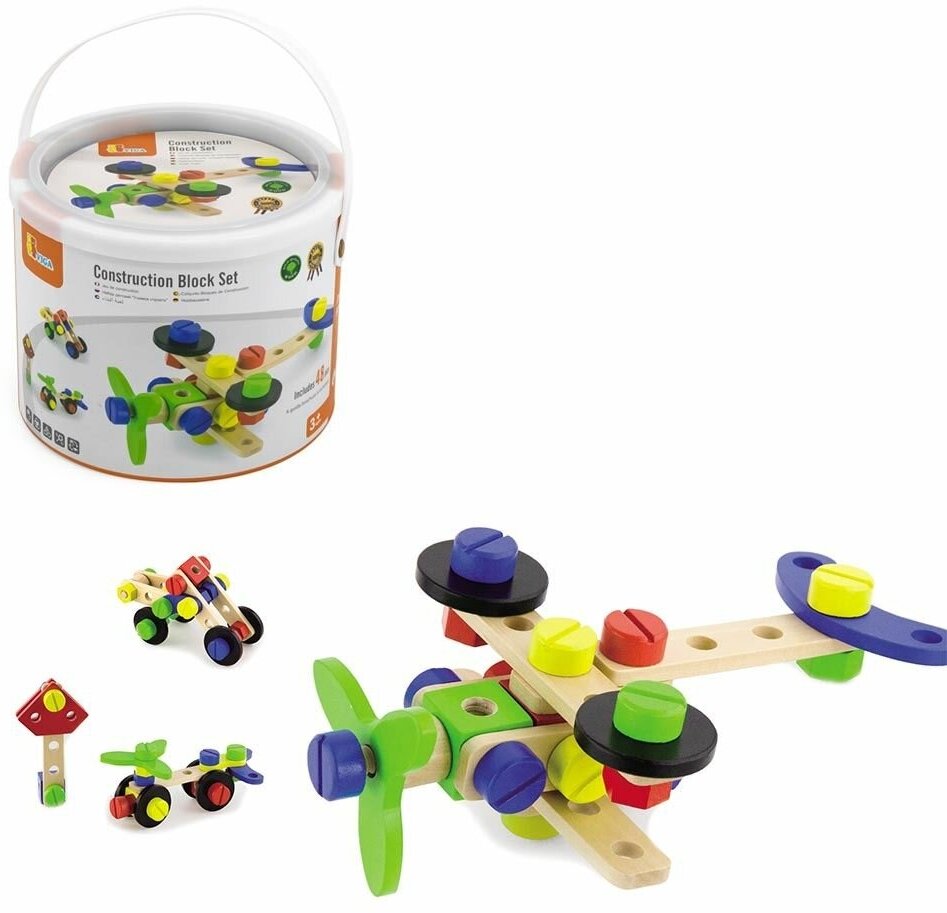 Деревянный конструктор VIGA в ведре идеально подойдет для малышей, кто любит строить и создавать что-то новое. В наборе 48 разных элементов: 4 колеса, отвертка, гаечный ключ, детали разных цветов и размеров, болтики и гаечки. С помощью этого конструктора малыш сможет не только собирать разнообразные конструкции, но и развить мелкую моторику рук, внимание, усидчивость, логику и воображение.