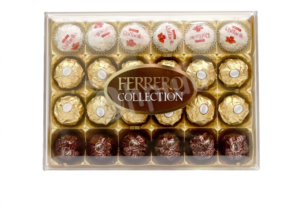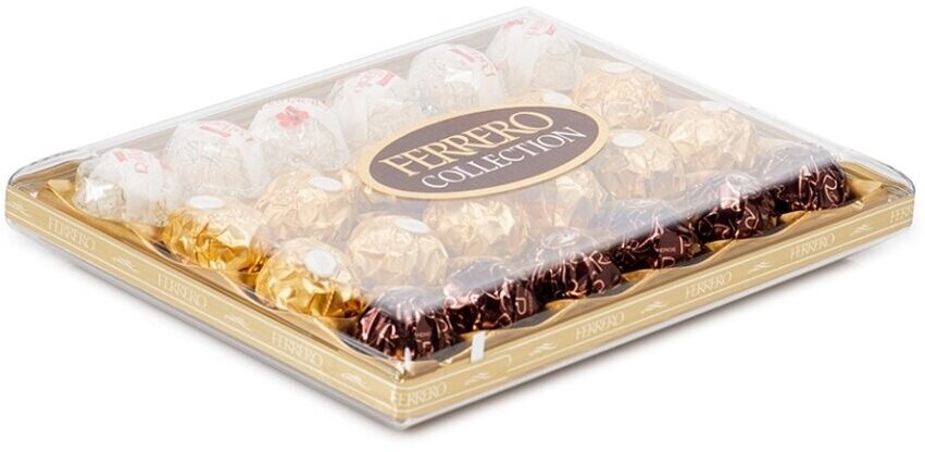 Опыт Ferrero позволил создать Ferrero Collection (Ферреро Коллекшн) - изысканное ассорти из лучших продуктов компании.Rocher: сочетание цельного фундука, покрытого восхитительным сливочно-ореховым кремом, и хрустящей вафельной оболочки с шоколадом подарит вам неповторимые вкусовые ощущения.Raffaello: гармоничное сочетание тщательно отобранных ингредиентов: выращенных на островах Тихого океана кокосов и калифорнийского белого миндаля.Rondnoir: яркий вкус хрустящей оболочки из черного шоколада со сливочно-шоколадной начинкой и жемчужины темного шоколада в центре.Ferrero Collection - это разнообразие вкусов и текстур, которые подарят радость каждому.